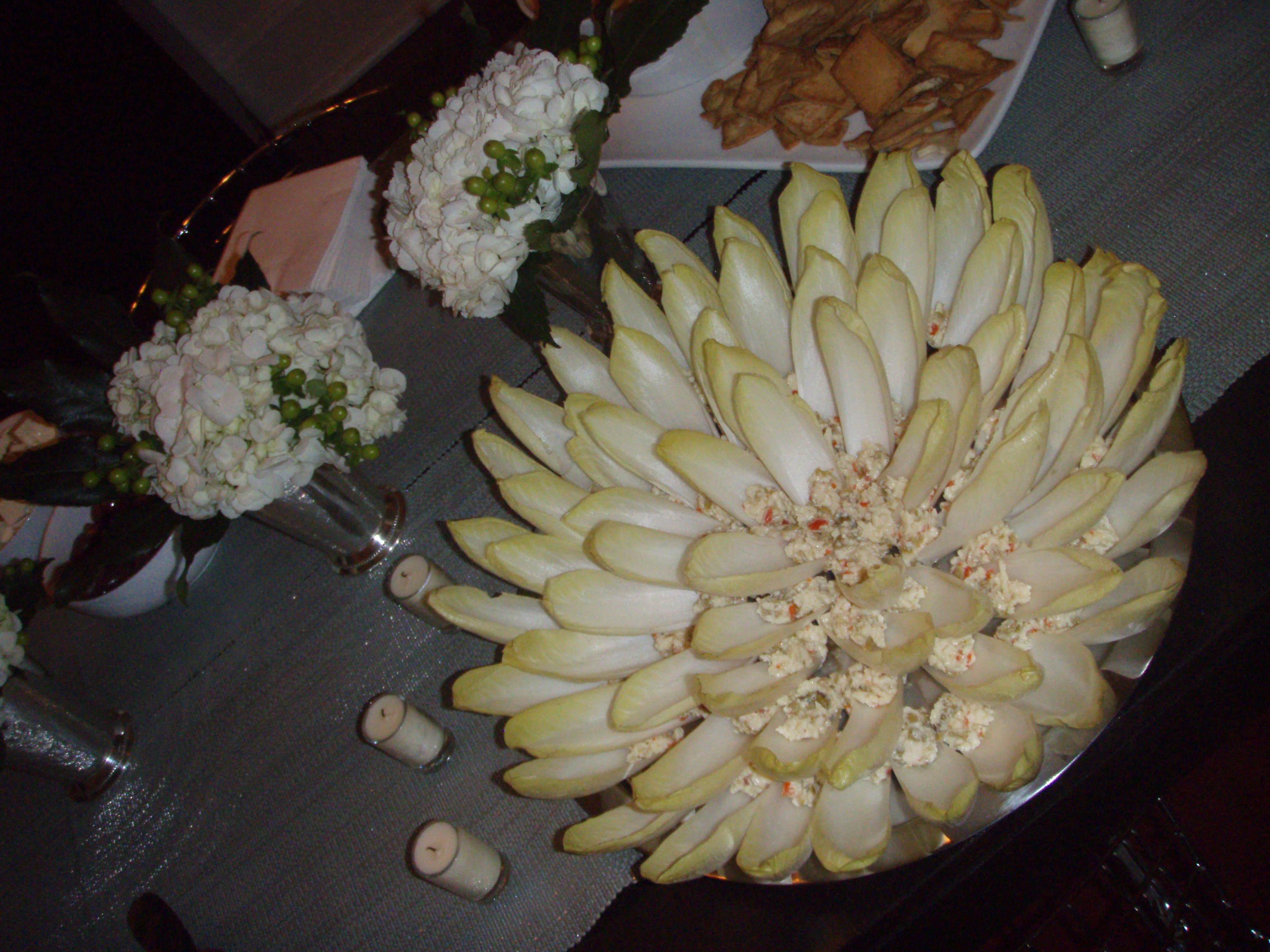 My friend John gave me this recipe for Pimento Cheese many moons ago. At that point there were directions for proportions. I’ve lost those since and I just mix the ingredients until they taste good and the spread is the right consistency. This recipe is a little different, as John puts both the olive and the pimento in rather than just the pimento. I think it adds an extra tasty bite! I served the pimento cheese in endive leaves for my party – but the leftovers were very good with crackers.