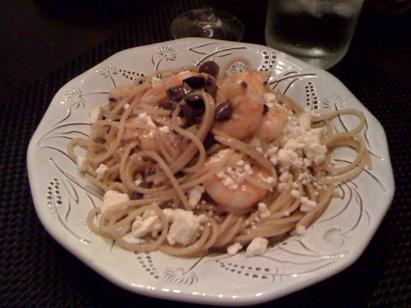 Season the shrimp with salt and pepper and saute in a pan with olive oil. Meanwhile, cook the pasta. Once the shrimp are cooked though remove them from the pan. Turn off the heat. Add the ouzo and then light using the flame from the stove or a lighter. BE CAREFUL not to add the liquor while the heat is on. And don’t sue me if your eyebrows are burnt off! Reduce the liquor and add the cooked pasta, olives, feta cheese and shrimp.