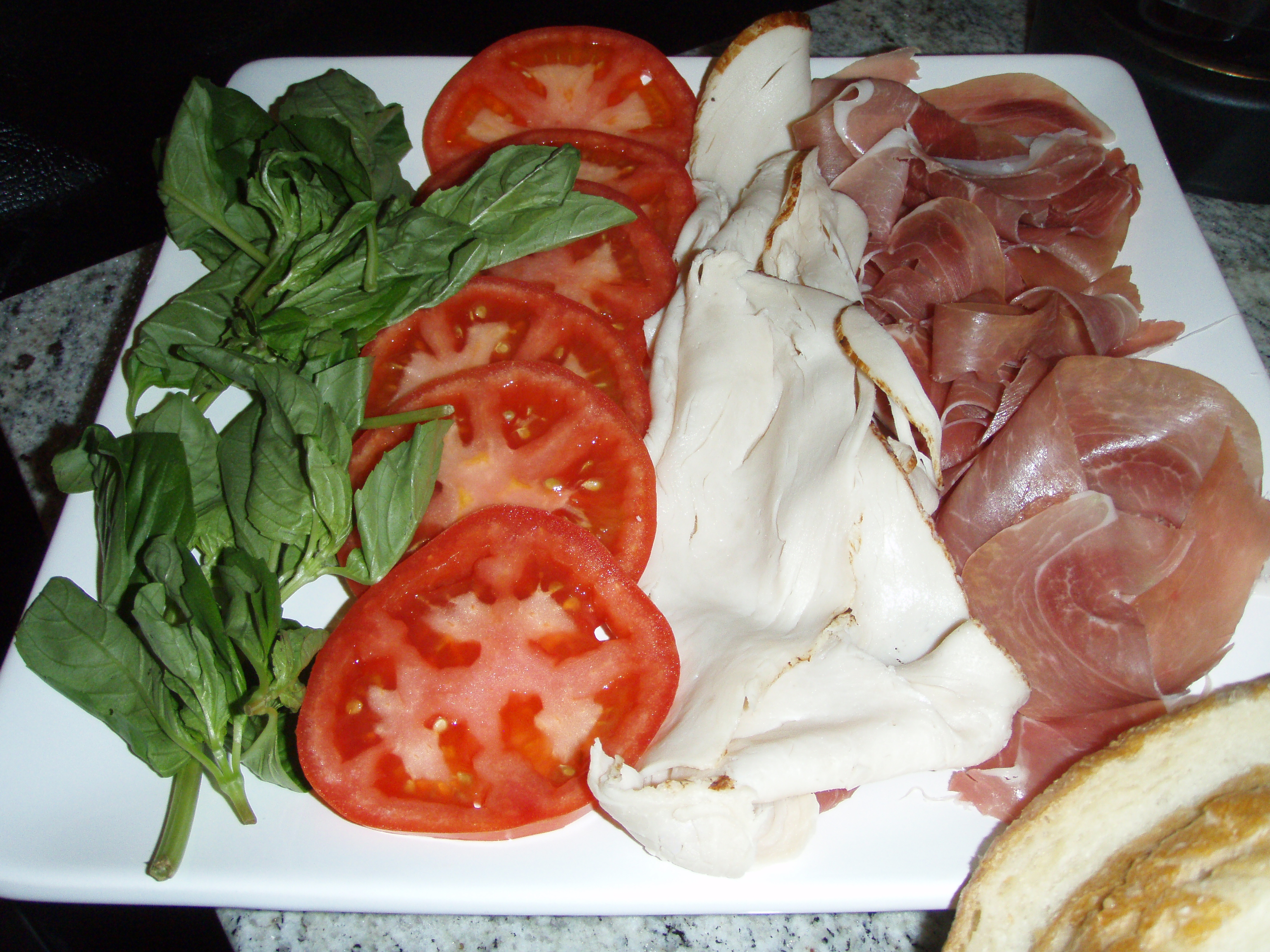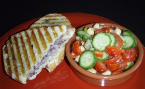 This year I wanted to take advantage of my new panini machine and thought – what could be better than paninis and martinis for Oscar night?! The options for paninis are of course endless. Like my friend Heather mentioned in her Mod Meals from Madison post, her partners Becci says “Sandwich recipes are nothing more than lists.” Hey Becci, do paninis count since they’re hot? Anyway, I arranged a couple options for assembly – meats (turkey and prosciutto), veggies (tomatoes and basil), and spreads (good mustard and homemade tapanade). Make your own “recipe” or “list” and enjoy! I’ll post the recipes for the starter stuffed mushrooms, lemon drop martinis and chickpea salad in the next couple days.