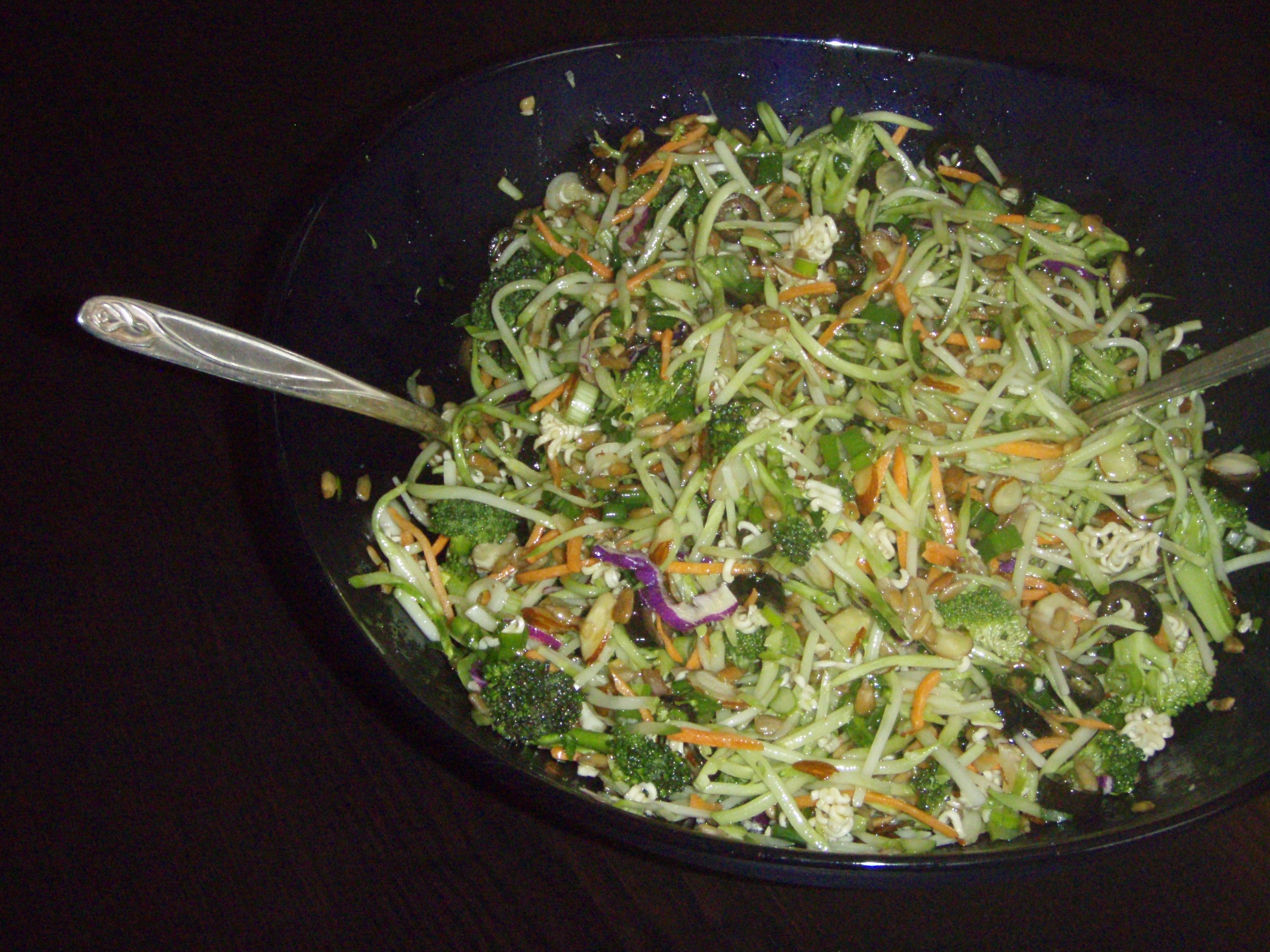 1. My friend gave me a very similar recipe, using beef ramen instead of chicken, and switch out olive oil for asian gingers sesame type salad dressing, and cranberries for olives. It’s tangy greatness!