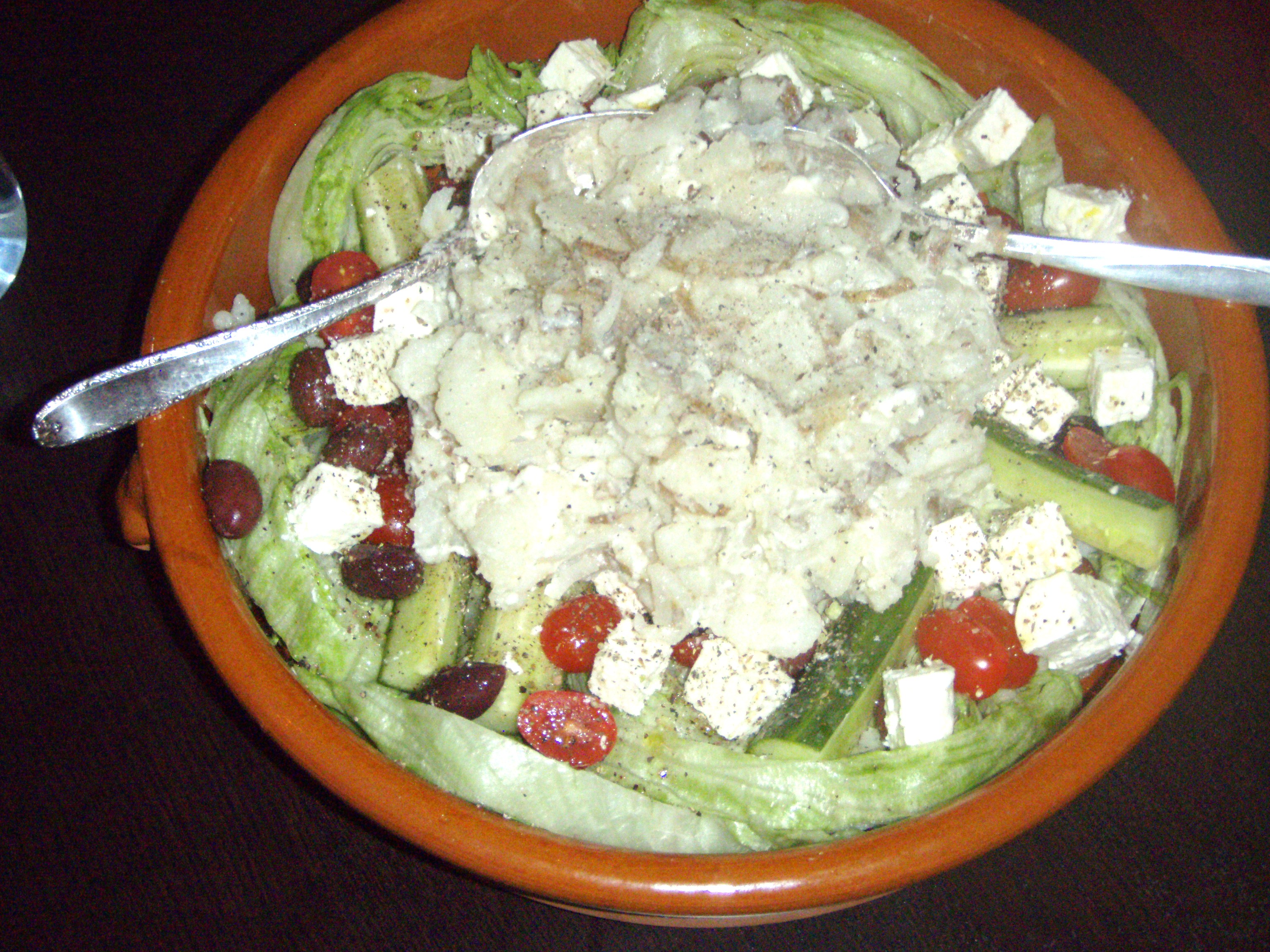 Assembly: Bring a large pot of very salty water to a roaring boil. Meanwhile, using a mandolin, cut uncooked potatoes (peeled or unpeeled) into 1/4 inch slices. Additionally slice the sweet onion on the lowest setting on the mandolin – I used 1/16 inch. Once the water is boiling, add the potato slices and monitor like a hawk. Once the potatoes are just tender (the water temperature lowered for me and I had to check the taters about every 3 minutes). Once tender, drain the potatoes and add the onions (the heat of the potatoes will slightly cook the onions). Dress generously with olive oil, red wine vinegar, salt and pepper. You want to taste to make sure they are seasoned will with both vinegar and salt. Refrigerate until cold. Once the potato salad is chilled well, add about 2 or 3 tablespoons of mayo. Don’t over do this – it is just to make them creamy not to add any flavor. In a large bowl, make a nest with large slices of iceburg lettuce. Top with olives, large chunks of cucumber, tomatoes and chucks of feta cheese. Dress the salad with olive oil, red wine vinegar, dried oregano and salt and pepper. Fill the nest with potato salad.