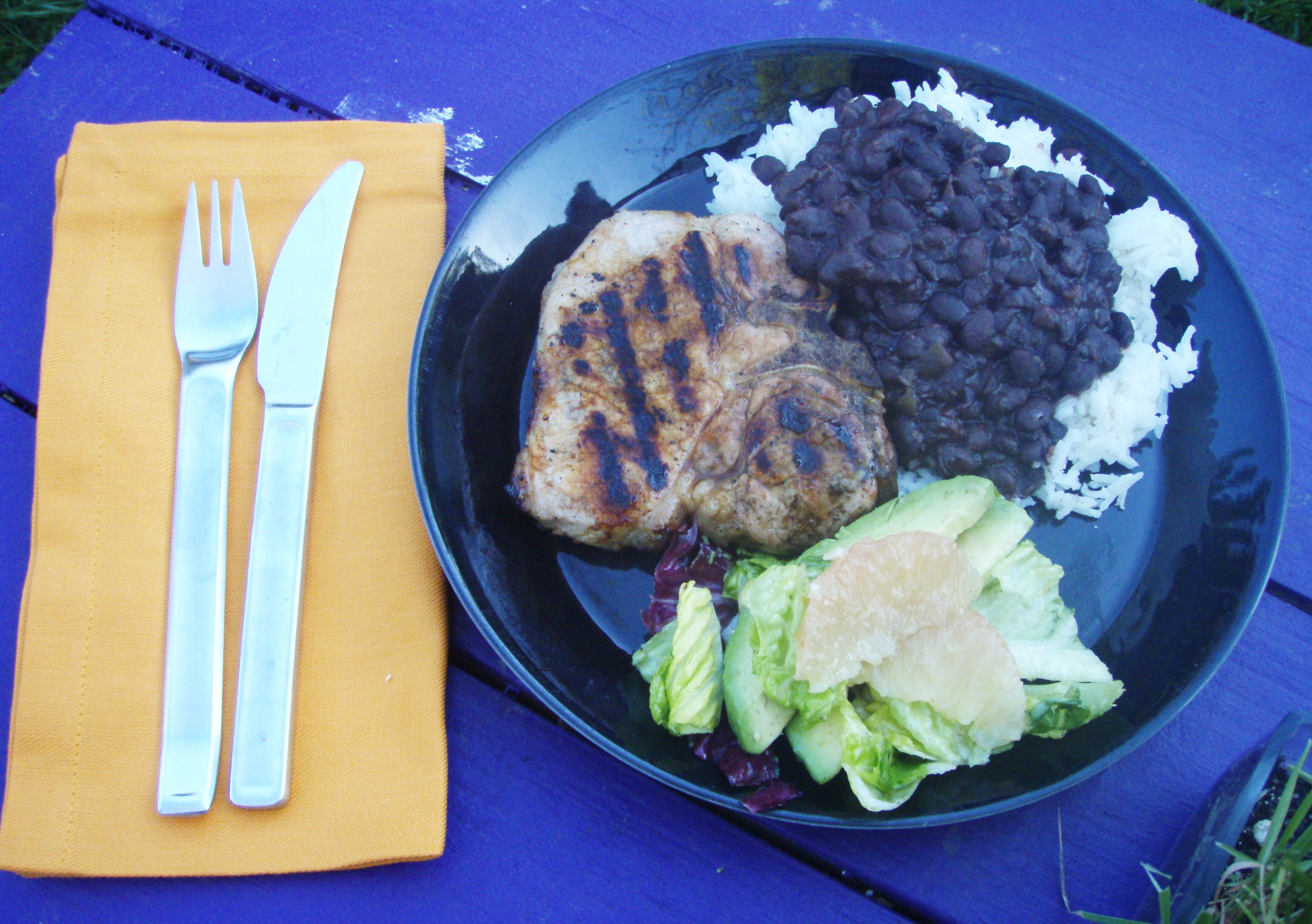 In honor of the spring cleaning season, this weekend I opened my freezer and fished out some odds and ends I stashed away this winter. I was surprised that I was able to put together a quick and delicious Cuban dinner from just a few key ingredients! I found a tub of  Black Beans left over from Michael and Tommy’s October visit and a container of sour orange juice I salvaged from my mom’s yard in Florida (I picked them up over Christmas). With just those two ingredients, I was able to put together a menu of Black Beans and Rice, Grapefruit and Avocado Salad and Cuban Sour Orange Marinated Pork Chops.  All I needed at the store was 2 pork chops, lettuce, an avocado, a grapefruit and an onion to make a quick, festive Cuban Sunday supper!  Spring Cleaning never looked – or tasted – so good!