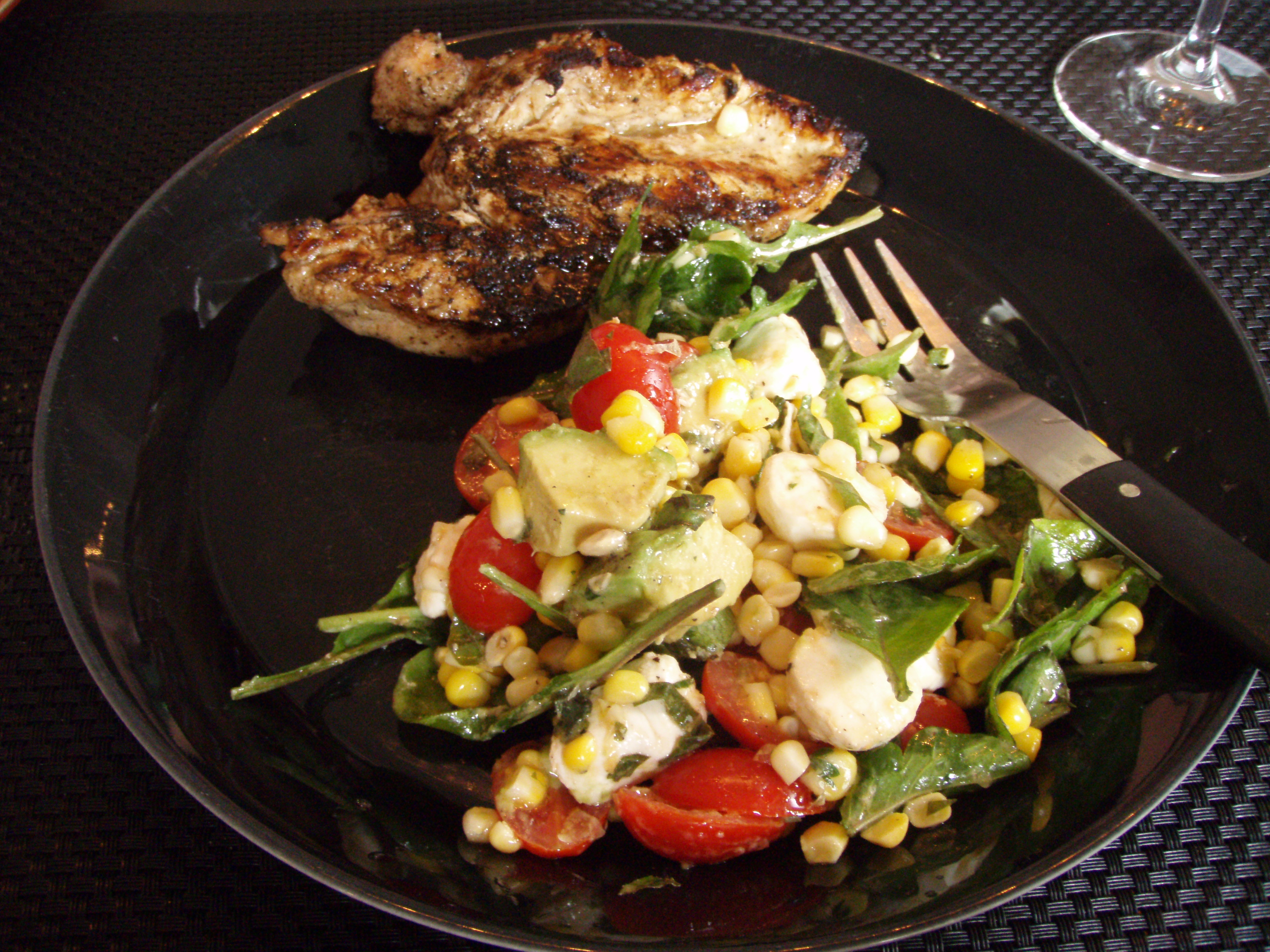 The day I came back from my beach vacation, I put together this a quick and fresh meal for my friend Beth and bunkmate Andy. After all the potato chips at the beach, this was the perfect fix of summer nutrition. I typically always have lemons, olive oil, salt and pepper in the house plus thyme in the garden. So, this mixture is a go-to for a grilled chicken. This recipe it best if you start the day before. I throw roughly equal parts lemon juice and olive oil in a plastic bag (I chuck the remaining lemon in too), add boneless skinless chicken breasts, a couple of sprigs of thyme and salt & pepper. The next day, cook the chicken on a hot grill and serve it with your favorite summer side. That night, I made Sarah Foster’s Avocado, Roasted Corn and Tomato Salad. I’ll post her recipe tomorrow.
