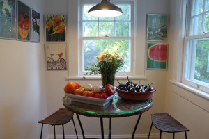 For the big blogiversary blow out, I wanted to find several seasonal side dishes that we’re quick to prepare and, of course, delicious. With the hint of Provencal in the menu, I brought out a book my Mom gave me for Christmas years ago before we took a summer tour of Provence together. The book, The French Market by Joanne Harris and Fran Warde, is full of beautiful photos of the south of France and many dishes the region has to offer. Almost all the recipes have very few ingredients yet are full of flavor – my kind of book! I chose the recipe for Aubergine Au Gratin because I had easy access to local tomatoes and eggplants at the Downtown Farm Market up the street and because I’ve been dying to use a ceramic baking dish I bought years ago at the Southern Season annual sale! For such an uncomplicated side dish, it tasted wonderful and put a punch of color on the table!
