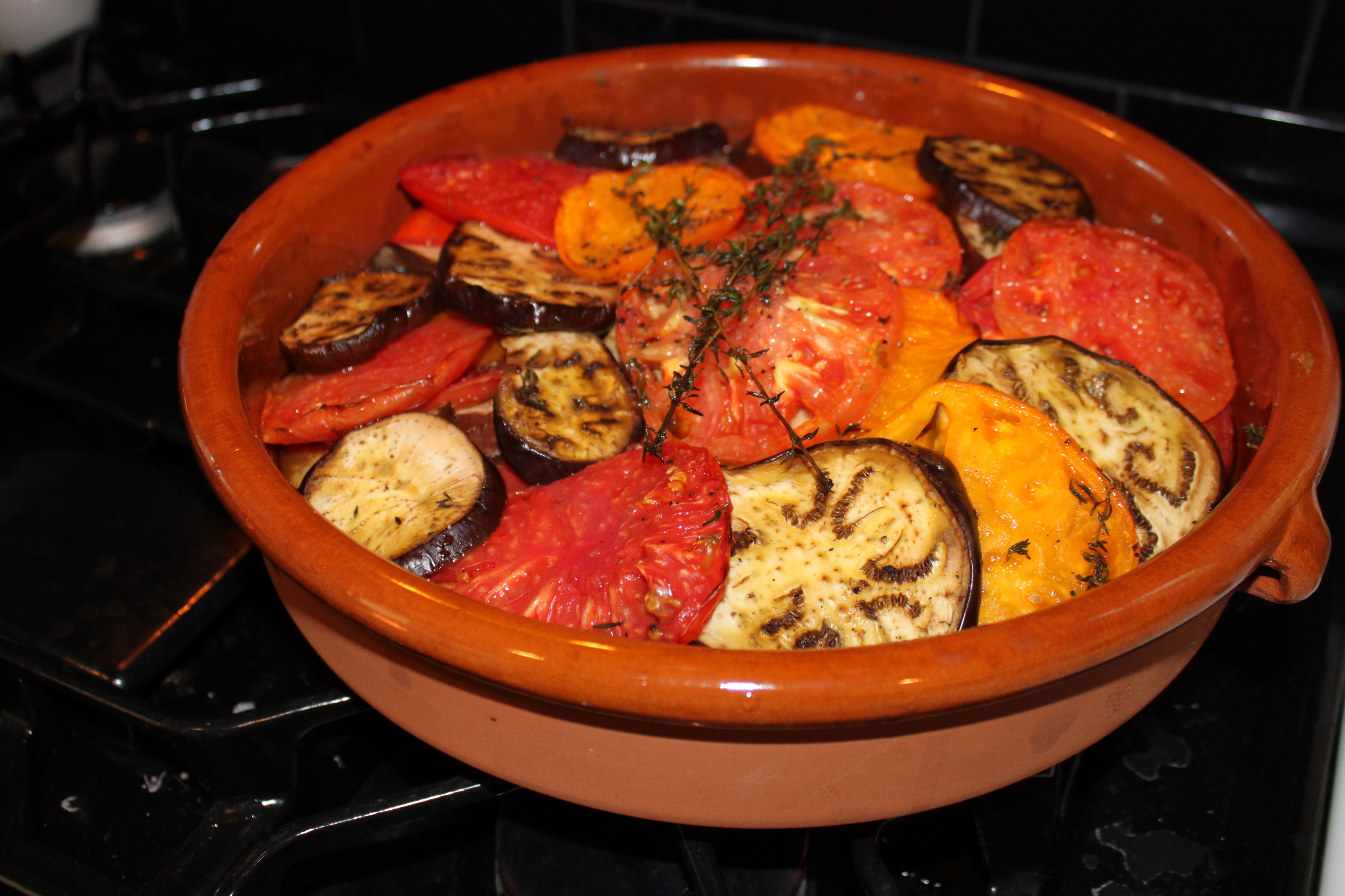 Assembly: Preheat oven to 350. Rub the dish with garlic and 1 tablespoon olive oil. Layer the vegetables around the dish and scatter with salt, pepper, thyme leaves and chopped up remaining garlic. Pour over stock and remaining oil. Bake, covered for about 45 minutes and uncovered for another 45 minutes.