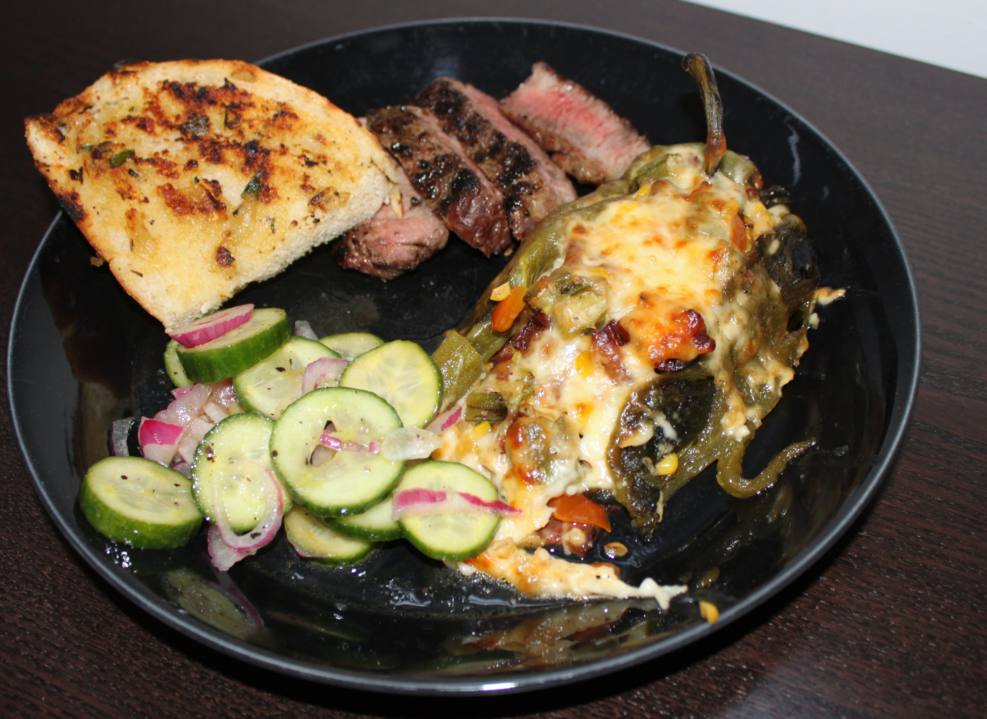The meal came together with ease as we sipped on the Pineapple Margaritas. Salt and pepper on the steaks plus butter, salt, pepper and basil from the garden on thick cut bread- all thrown on the grill. We sliced cucumbers and red onion and dressed them with olive oil and red wine vinegar for a quick salad with a kick (I recommend doing this slightly in advance to let the flavors set). I don’t think they could have done better in the Lone Star State.