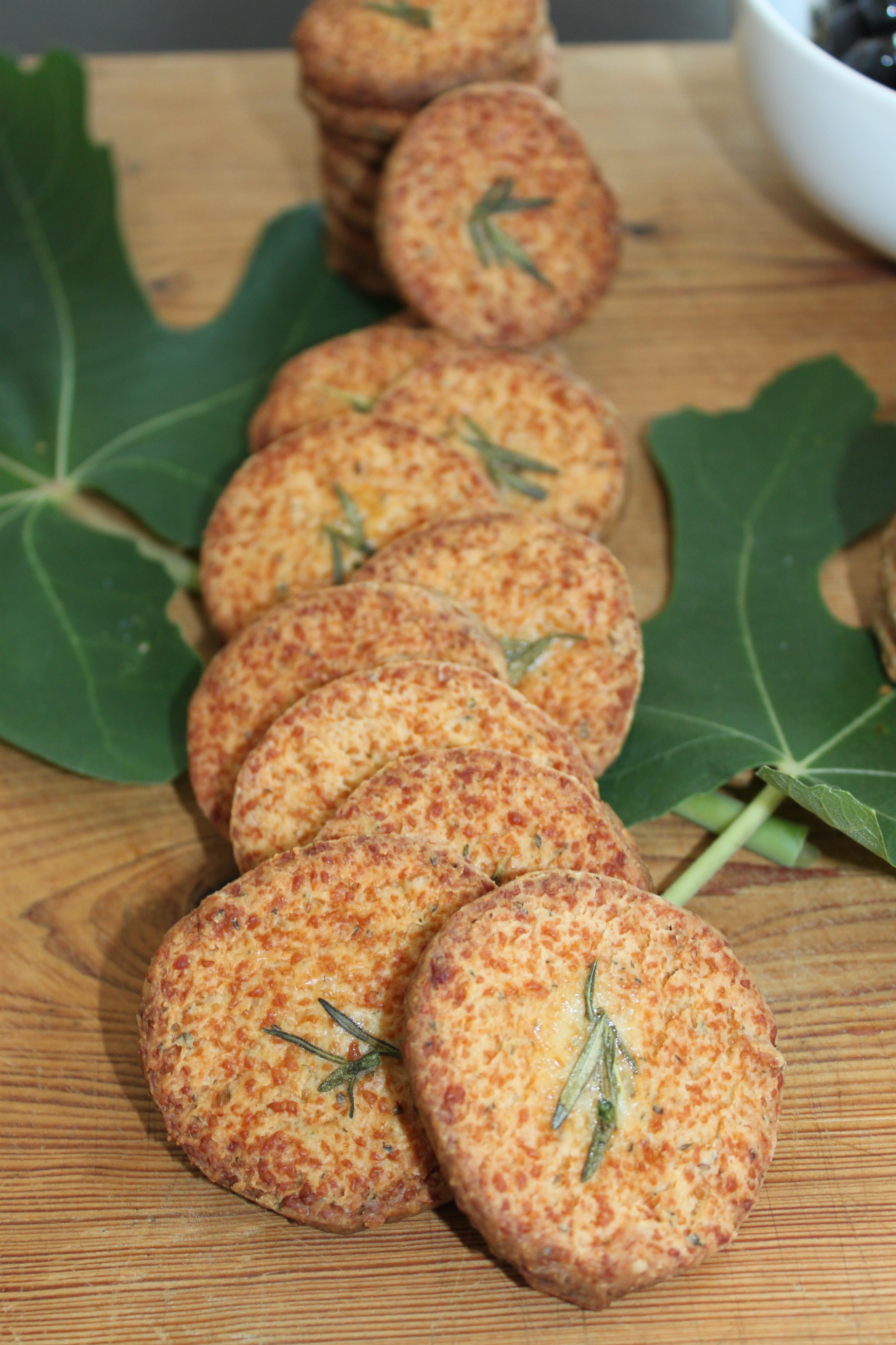 Slice the crackers in 1/4 inch slices. Use the egg white as an adhesive to garnish the cracker with a sprig of rosemary. Bake at 325 degrees until golden and firm.