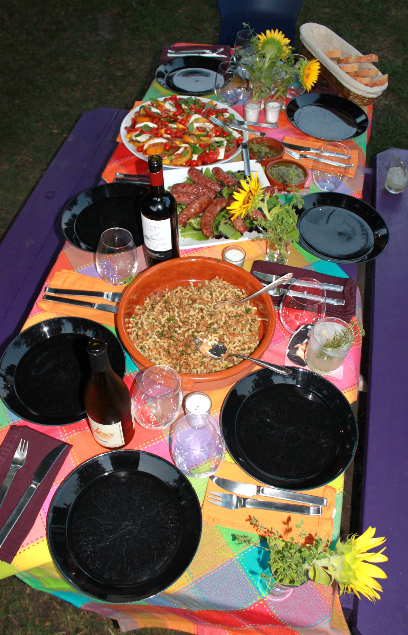 This weekend, the weather cooled off in time for a meal in the garden full of fresh seasonal ingredients. Saturday night, I broke out the bocce set and prepared an Italian al fresco feast for friends. With the ripest of flavors at the market, simplicity was the only route to take. Tomatoes, crusty bread and flowers from the Greensboro Curb Market and a quick trip to Giacamo’s Italian Market for fresh mozzarella and sweet Italian sausage – the dinner came together with very little effort. The grand finale to the evening was a bright purple Summer Pudding topped with a giant cloud of rum whipped cream. I dressed the table in bright shades and small arrangements of sunflowers from the Market (how can you beat .30 cents a stem) and fresh oregano from my herb garden.
