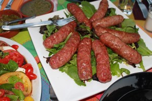 Along with a beautiful display of Caprese Salad, I picked up sweet Italian sausages from Giacamo’s Italian market in Greensboro. I planned on grilling them and serving them over lightly dressed greens – but of course I ran out of propane and ended up just tossing them into a 400 degree oven for 30 minutes. They turned out just as delicious – despite the phallic jokes coming from the rowdy end of the table (you know who you are).