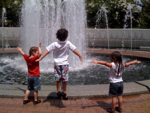 We seem to be developing a ritual at Action Greensboro to host celebrations with picnics in our own urban playground – Center City Park. We are some of the lucky few that can excuse a walk to the park for work – and I personally love to take advantage of it on sunny days. It was more than sunny this Monday in the park while we celebrated April’s birthday. A picnic spread (complete with tablecloth) of Roasted Pepper Sandwiches, Tomato and Watermelon Salad, Pickled Okra and Peanut Butter Bars. We dined with the mist of the fountain and the view of kids running barefoot under the arches. Not too shabby for a Monday working lunch.