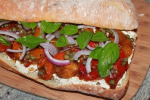 I made Ina Garten’s Recipe for Roasted Pepper and Goat Cheese Sandwiches. I used light veggie boursin cheese instead of the goat. It made for a more messy and less tangy addition – I’d go with the goat cheese if I made it again.