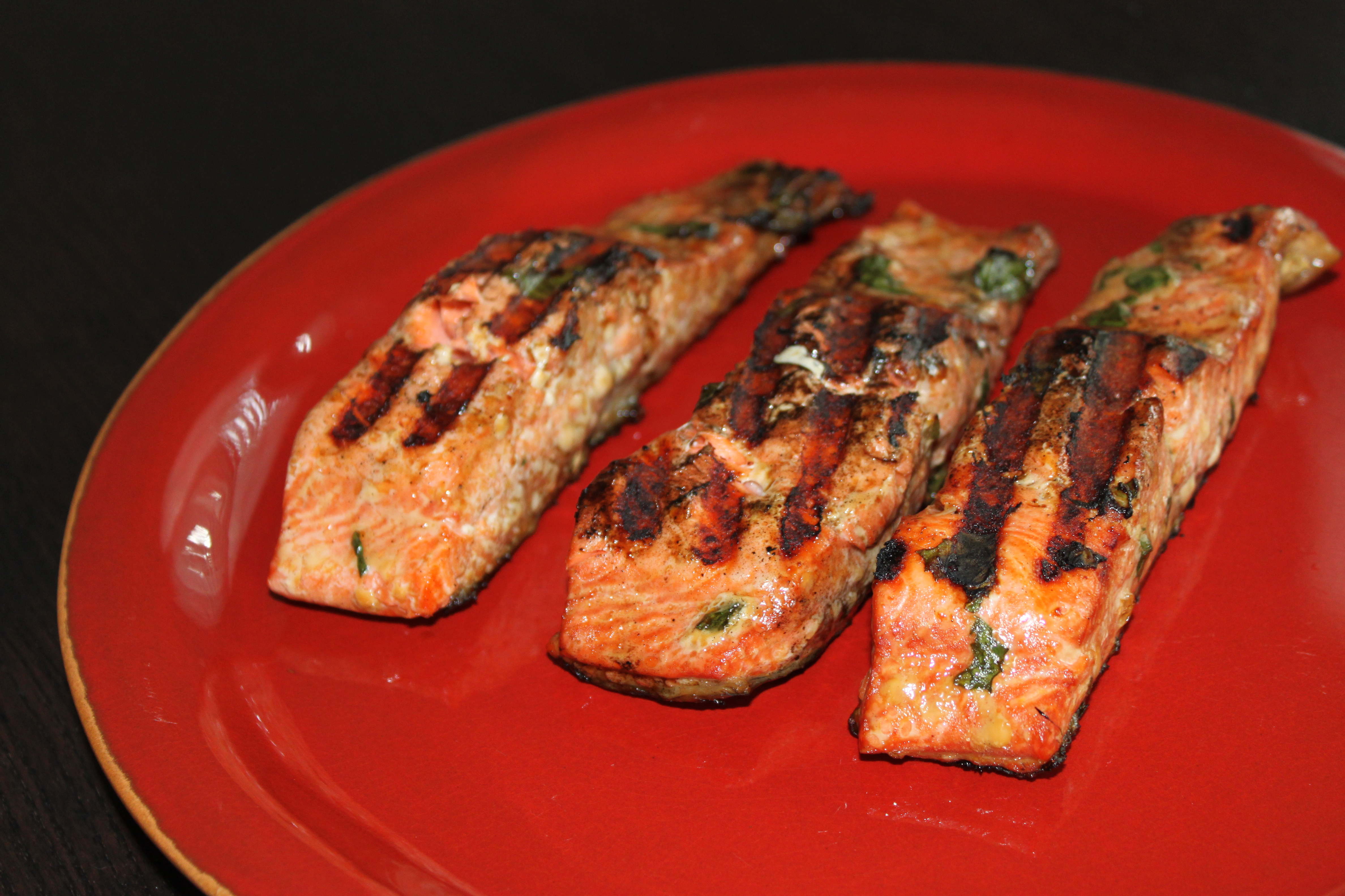 Assembly: Combine all the ingredients except for the salmon. Whisk together to make a marinade. Add the salmon and coat. Marinate the salmon, skin side down, for an hour or up to overnight. When ready to grill, throw them on a hot grill (skin side down) for about 4 minutes per side.
