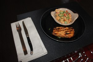 I used Bon Appetit’s recipe for Grilled Pork Tenderloin with Molasses and Mustard but used the on sale chops instead.