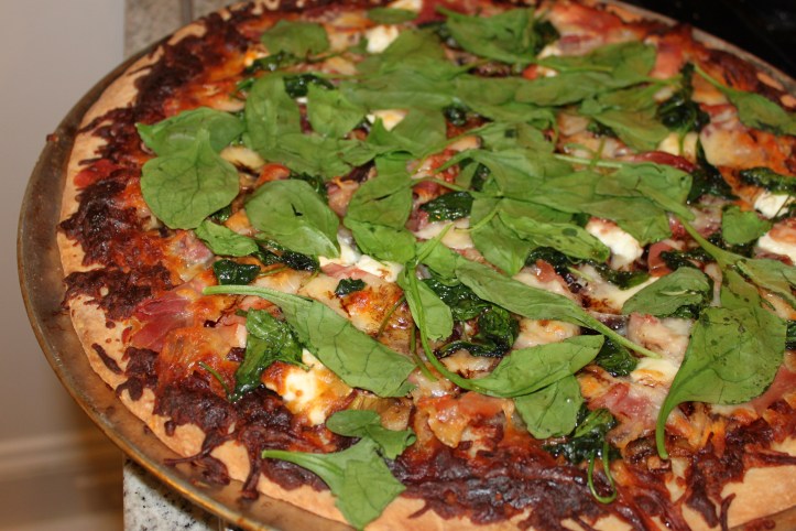 Frozen pizza dough came in handy the day after my baking bootcamp. With little energy, good friends and a couple ingredients, we put together a fantastic dinner. I thawed out leftover pizza dough from my Freshman Fifteen Potato Pizza night, Aaron sauted an onion and layered goat cheese, mozzarella and figs between a butter slathered dough. We baked until the dough was almost crisp and then layered thin prosciutto slices and fresh spinach on top. It was a prefect compliment to a glass of wine and a lazy evening. Try this while fresh figs are out! This sweet and savory combo is a winner!