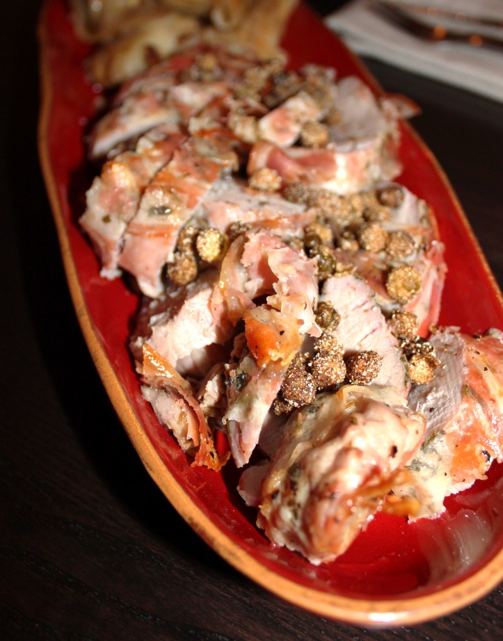 Assembly: Marinate the pork in a mixture of olive oil, rosemary, sage, fennel, salt, pepper and garlic for about 4 or 5 hours (or overnight). About an hour and a half before you want to serve, take the pork out – and rub off a little of the marinade (not all of it, this isn’t scientific). Place the pork on a roasting pan and layer slices of pancetta over the top of the tenderloins. Let the meat come to room temperature – this will take about an hour. Meanwhile, preheat the oven to 375 degrees. Roast the pork for about 30 minutes or until the meat is 150 degrees in its thickest part. At this point you may want to quickly broil the top of the meat if the pancetta isnt crispy enough (that was my solution). Let the meat rest about 10 minutes and slice thinly. Arrange the meat and scatter fried capers on top!