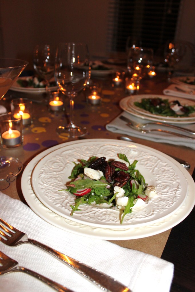 There is no doubt that the star of this salad was the candied pecans that topped it (literally and figuratively). I’ll post that recipe tomorrow. This is simple salad yet showcases a great hidden gem of vegetables – the radish! We used baby arugula instead of mache and a somewhat stinky goat cheese instead of blue cheese. If you make this, certainly stick with the radishes and sweet pecans – the bitter and sweet balance tremendously!