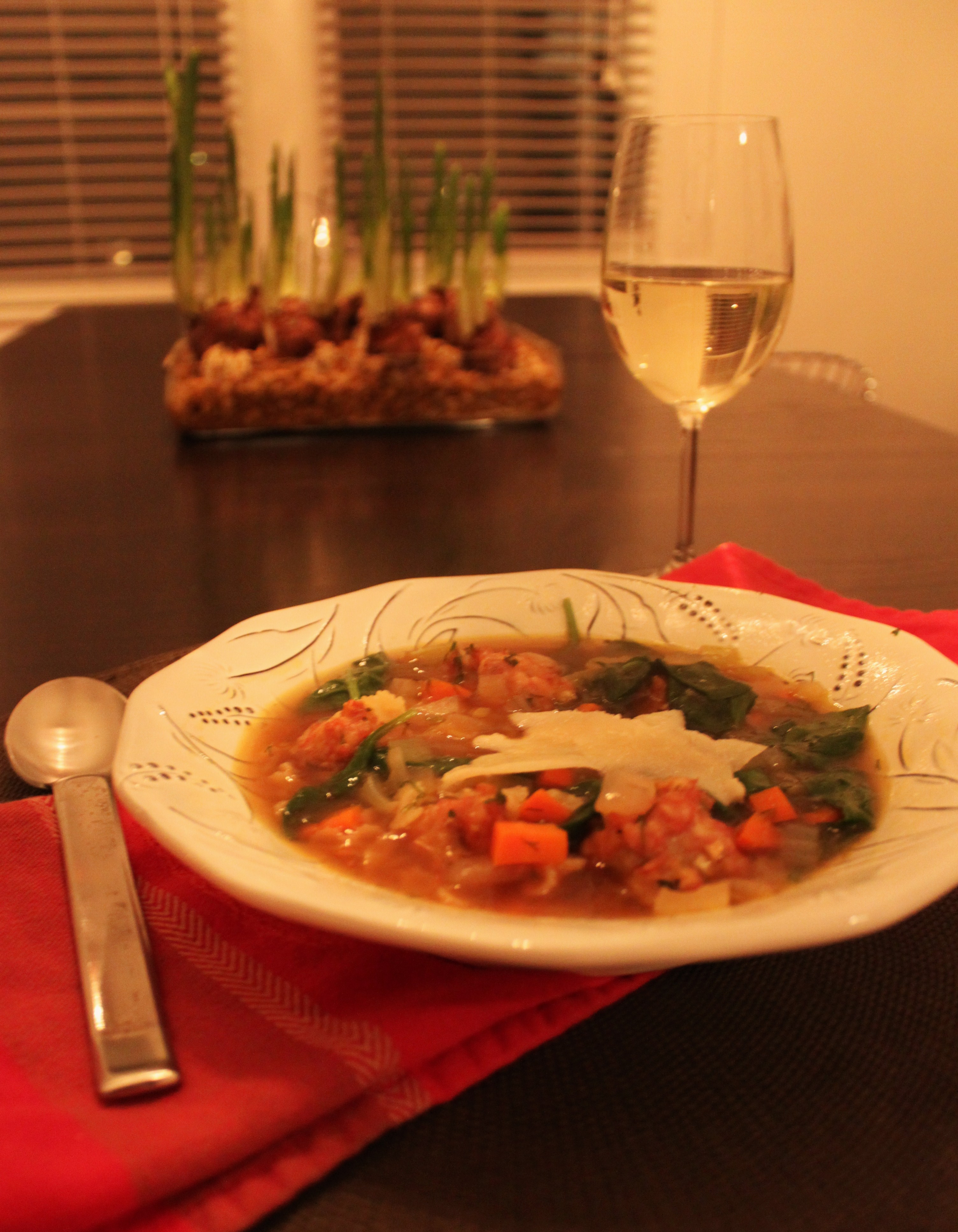 I’m not sure if I should start this post with a long honest “Brrrrrrr,” or that classic holiday song “Baby It’s Cold Outside.” Either way, it sure is cold in North Carolina and this weather requires serious comfort food to warm you up. Monday night I needed a recipe that I could make after a long days work and arrived at Ina’s Italian Wedding Soup. Like all of Ina’s recipes, she recommends using homemade chicken stock – which I obviously did not have time to throw together – so I made a couple of shortcuts thanks in part by my local Fresh Market!