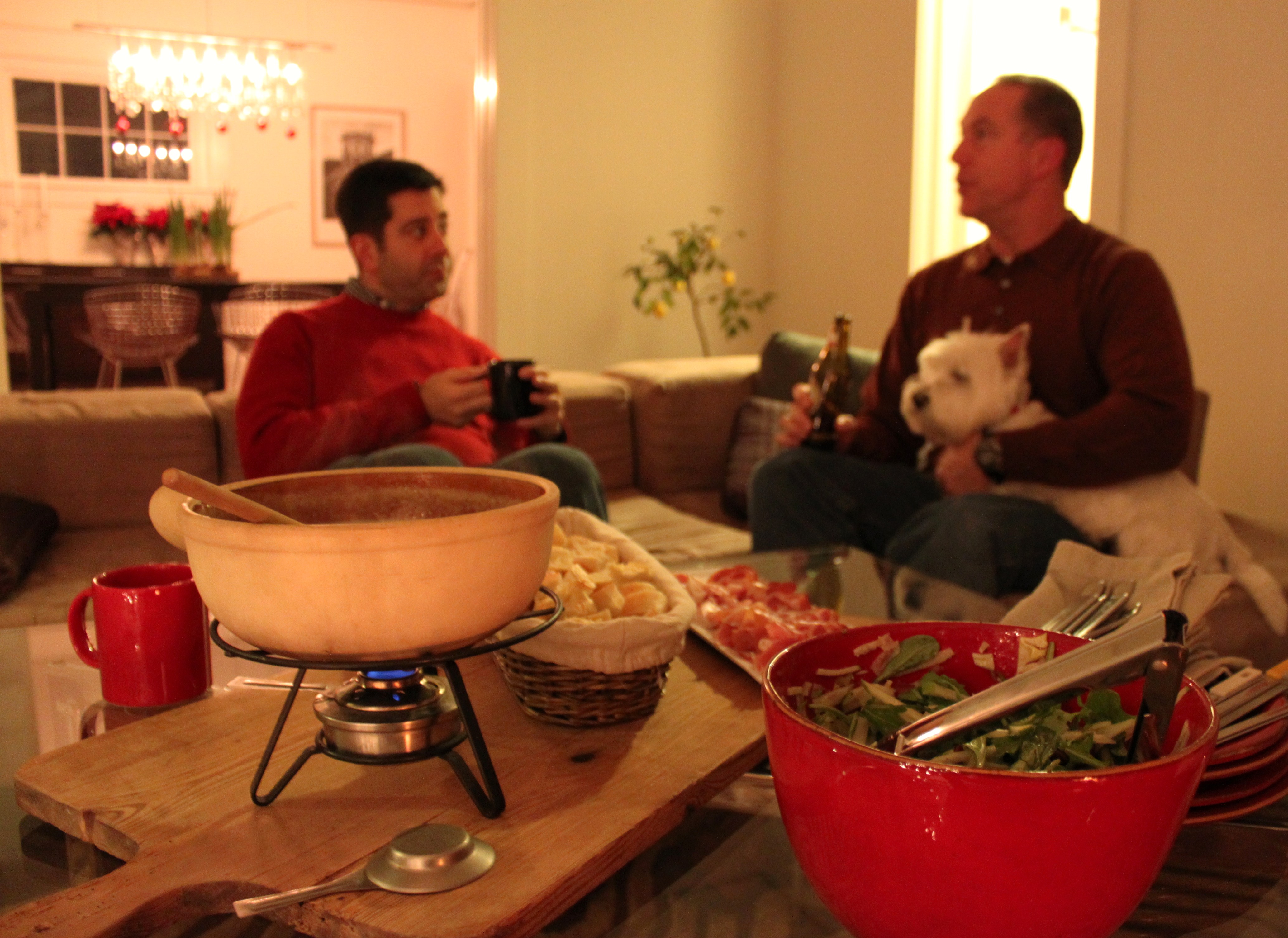 After attending that party, I decided to take myself out of the running for most fun Christmas party this year. As much as I love to plan and host a party, I needed a break and only wanted to spend a quiet evening home with my closest Greensboro friends by the fire with good food. And for a close crowd of four, cheese fondue by the fire couldn’t be a better menu. I served everything at once and we snacked and drank our way through the evening. I recommend this highly for your next cold night gathering.