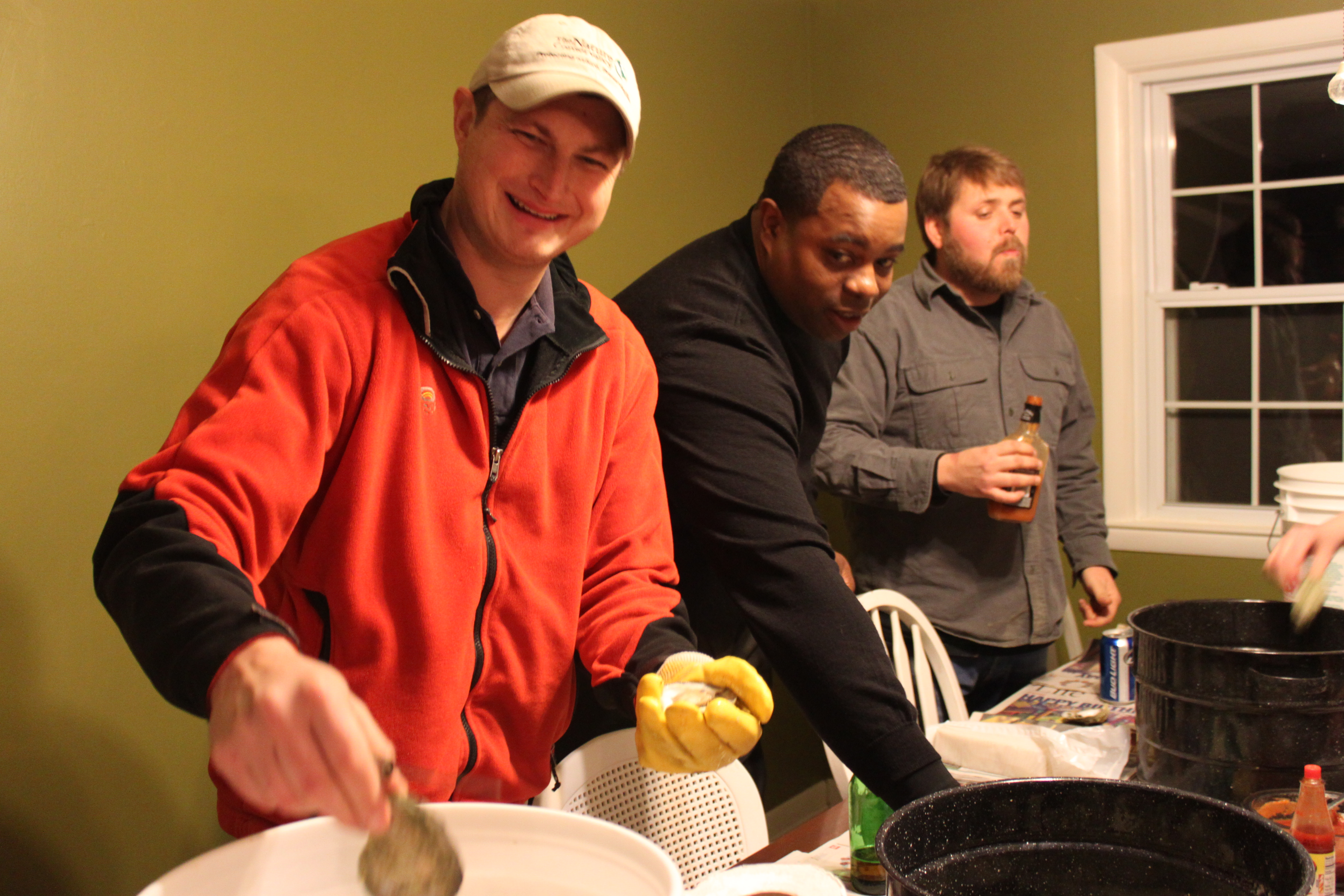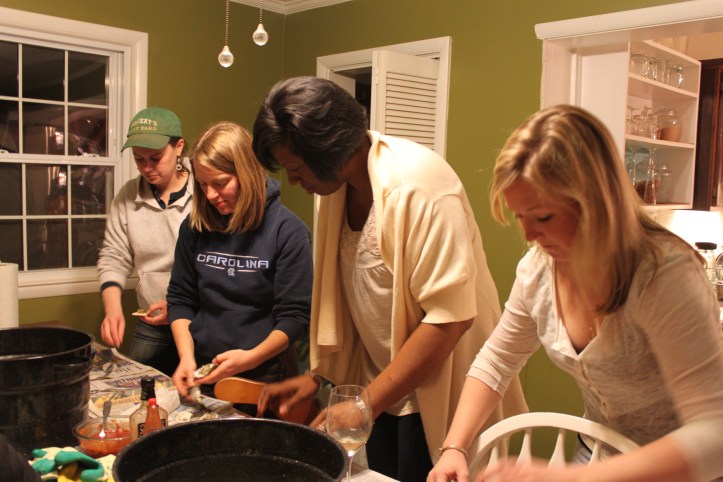 This weekend I headed south to Julian, NC for an oyster roast at my friend’s Stephanie and Alex’s home. Getting out-of-town, even just twenty miles, is always refreshing especially when it includes fresh foods and friends. Additionally, their chickens, “the girls”, and pups, Wyatt and Maggie, make their home that much more fun. Stephanie and Alex entertained a crowd with large steaming pots of oysters picked up at the Greensboro Curb Market with abundant sinus clearing sauces, a variety of “fancy” (as the guys called him) toasted cheese sandwiches, Margaret’s humus and creamless tomato soup and a cast iron skillet apple and dried cherry bread pudding from Mendenhall Street. By the end of the night, I was stuffed with good food and saucy gossip. I’ll post a few recipes this week from our evening.