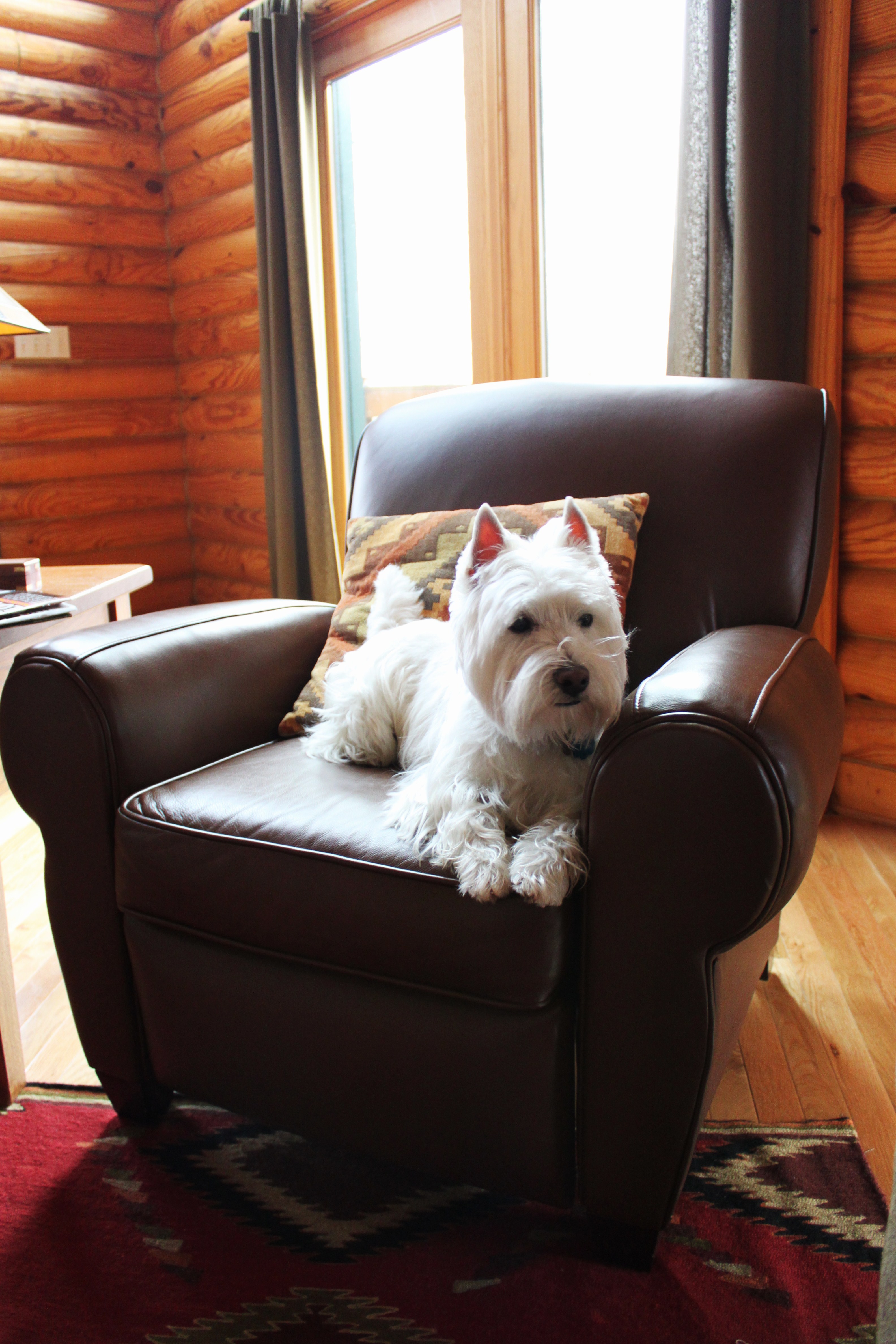 Winston looks like he really knows how to make himself at home. He is cute even though he has a pink nose.