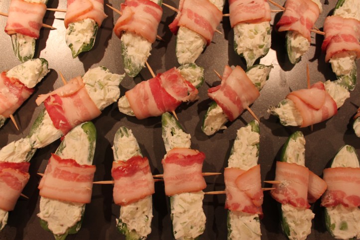 Fill each jalapeno half with the cream cheese mixture; fill until just over the rim of the jalapeno. Wrap each pepper with a bacon half and secure with a toothpick. Line up the pop ’ems on the prepared baking sheet and pop into the oven until bacon has browned on the bottom, about 30 minutes. Allow to cool for about 5 minutes
