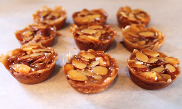 2. For the topping, mix corn syrup, brown sugar, ¼ cup butter and cream in medium saucepan. Bring to boil on medium heat. Remove from heat. Stir in extracts and then almonds. Pour over hot crust, spreading evenly.