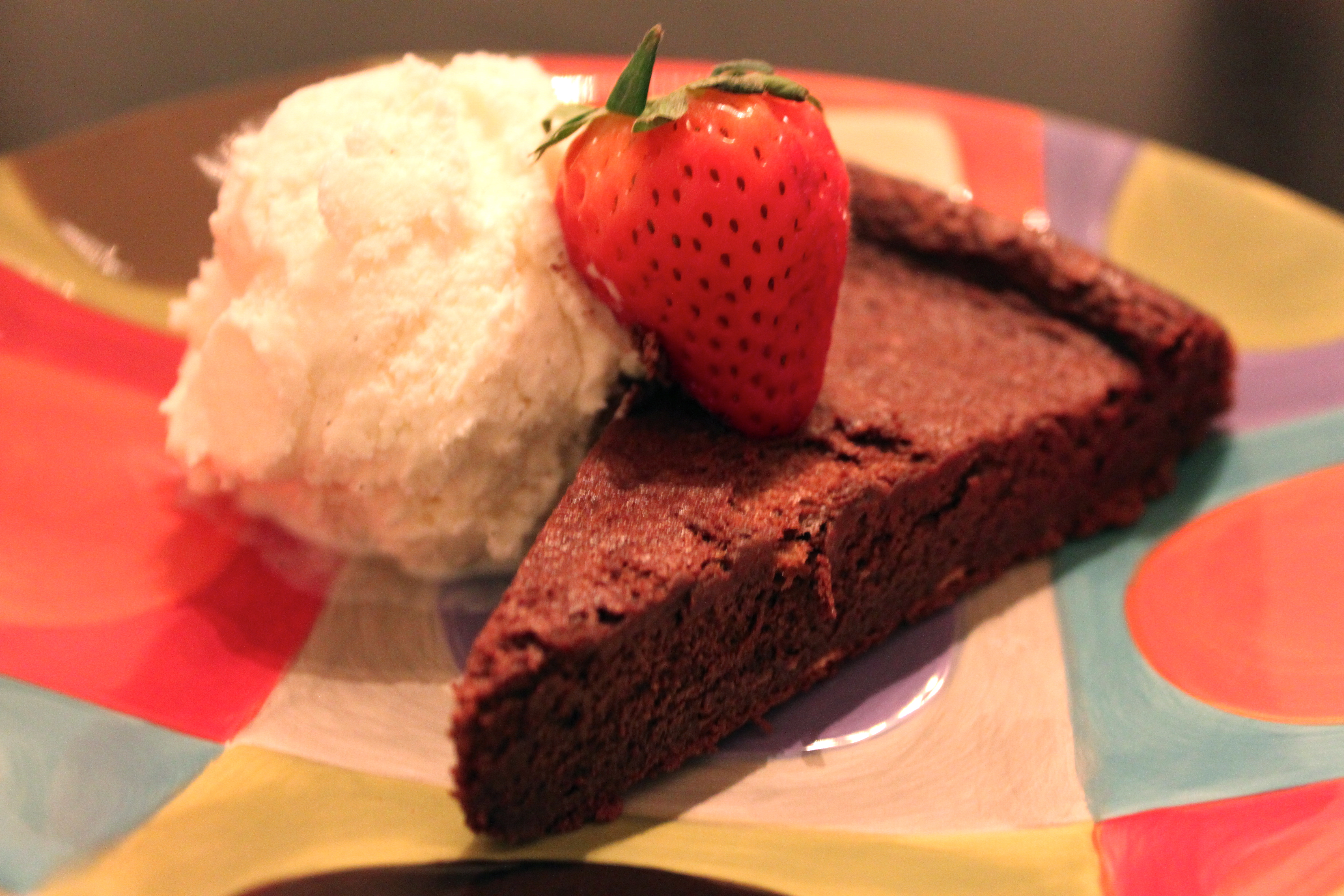 Assembly: Preheat the oven to 350 degrees. Butter a 9 or 10 inch spring form pan and dust with sugar. In a small pot, melt together the chocolate and butter on low heat, stirring frequently. Allow to cool. Separate the eggs and beat the yolks into thick ribbons. Then beat the egg whites to soft peaks. Combine the cooled butter/chocolate mixture with the egg yolks and then gently fold in the egg whites. Fold these into the mixture in thirds to avoid over mixing. Add to the pan and bake for 30 to 35 minutes. The edges of the cake should be set and the middle still soft.