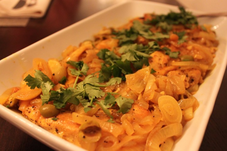 It is hard to see the chicken through all the turmeric stained onions, olives and preserved lemon – but it is in there! After researching a number of different methods of Moroccan chicken, I opted for this recipe because of its simplicity and timeliness. Most chicken tagine recipes require a laundry list of odd spices (which can add up your grocery bill), a full day of cooking and an entire bird cut into pieces. With limited resources at my disposal,  I picked a quick recipe with boneless skinless chicken breasts and limited spices (I only had to purchase one). This recipe took less than 40 minutes to prepare and was an easy entry into cooking with unique spices.