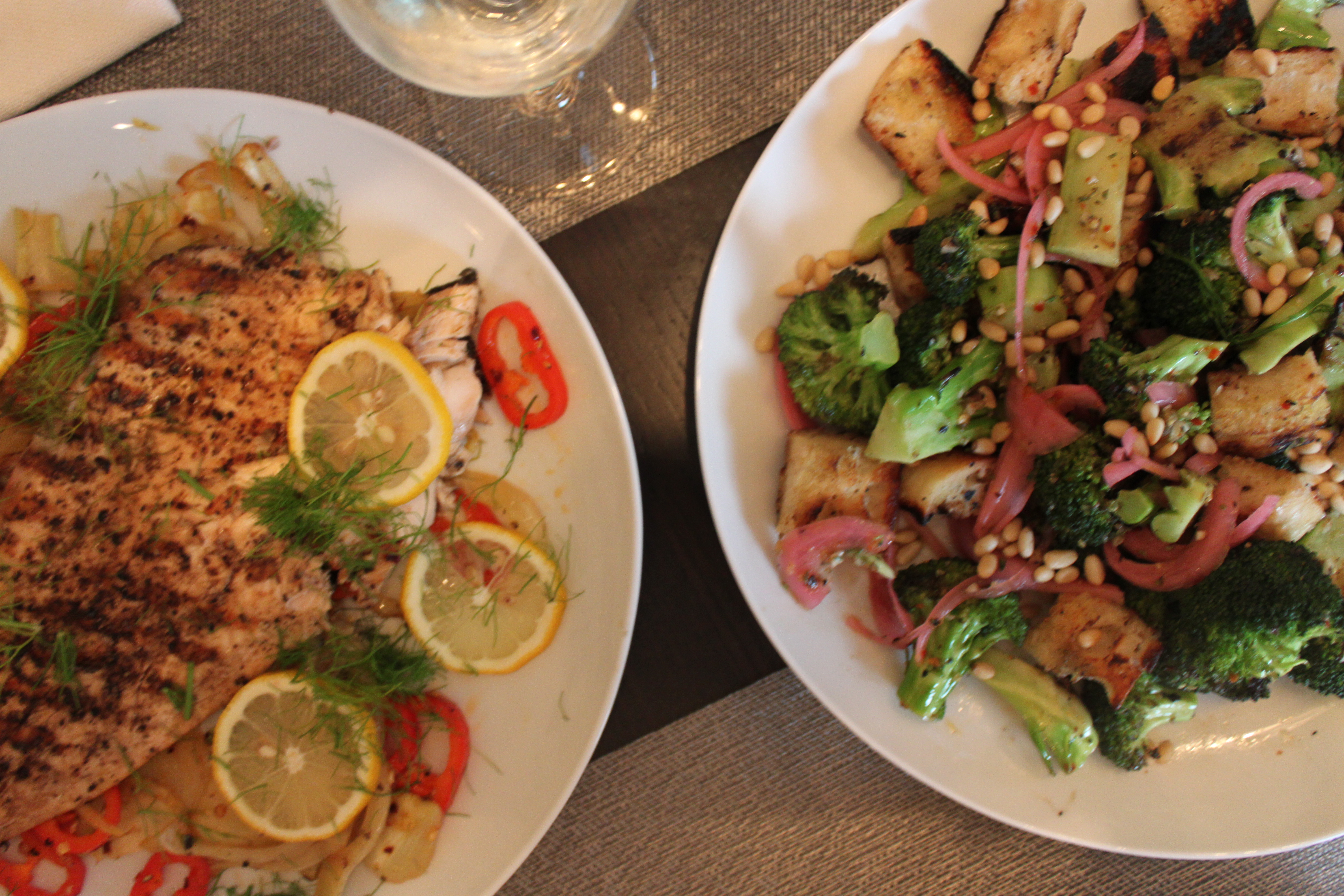• Grilled Broccoli and Bread Salad with Pickled Onions and Pine Nuts