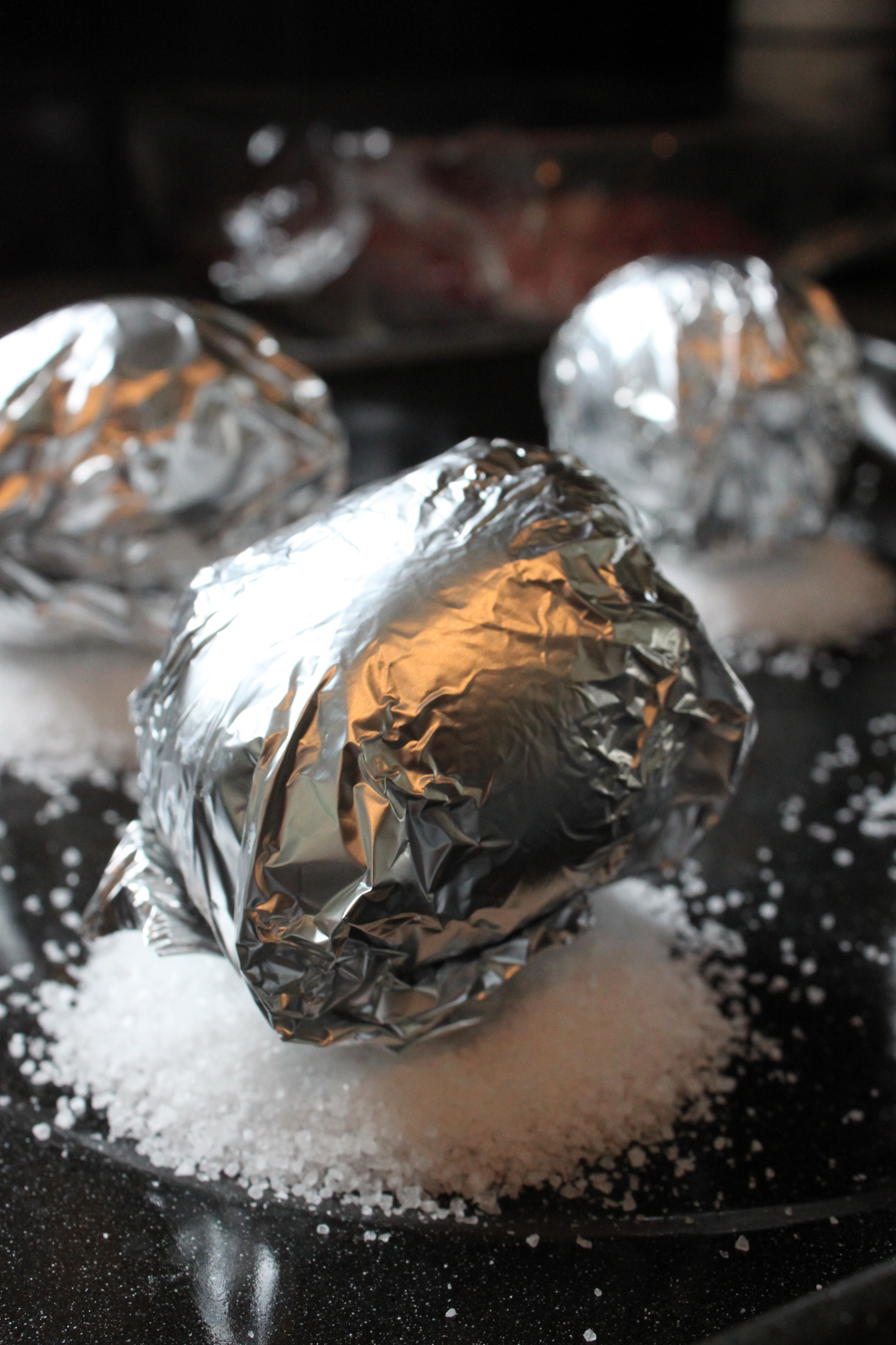 • I think the salt might be just to A) keep the lemons upright and not rolling around and B) keep the packages up off of the metal baking sheet. I don’t think it has much to do with flavoring, though some of the salt might work it’s way into the steam of the lemon.