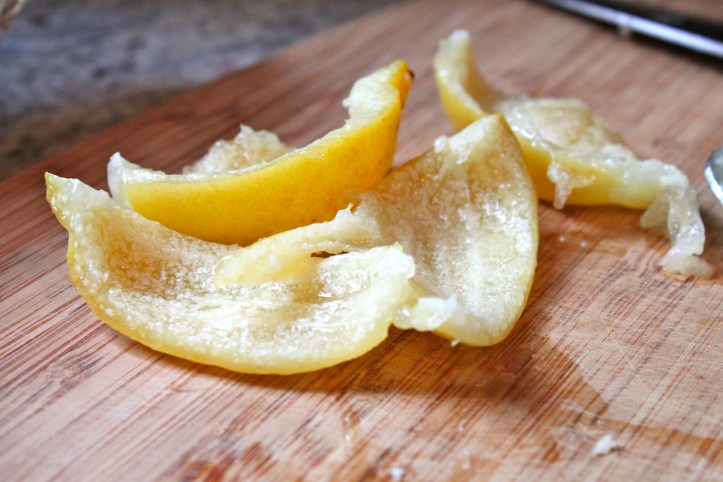 Preheat the oven to 325 degrees. Roll each lemon in aluminum foil. Place on top of a mound of salt with the seam side down. Roast until packages are soft – about 1 and a half hours. Allow to cool. Cut the lemons in half and scoop out the roasted flesh into a sieve (removing any seeds). Using a spoon, scrap the white pith off the remaining lemon peel. Discard the pith and chop the remaining lemon peel.