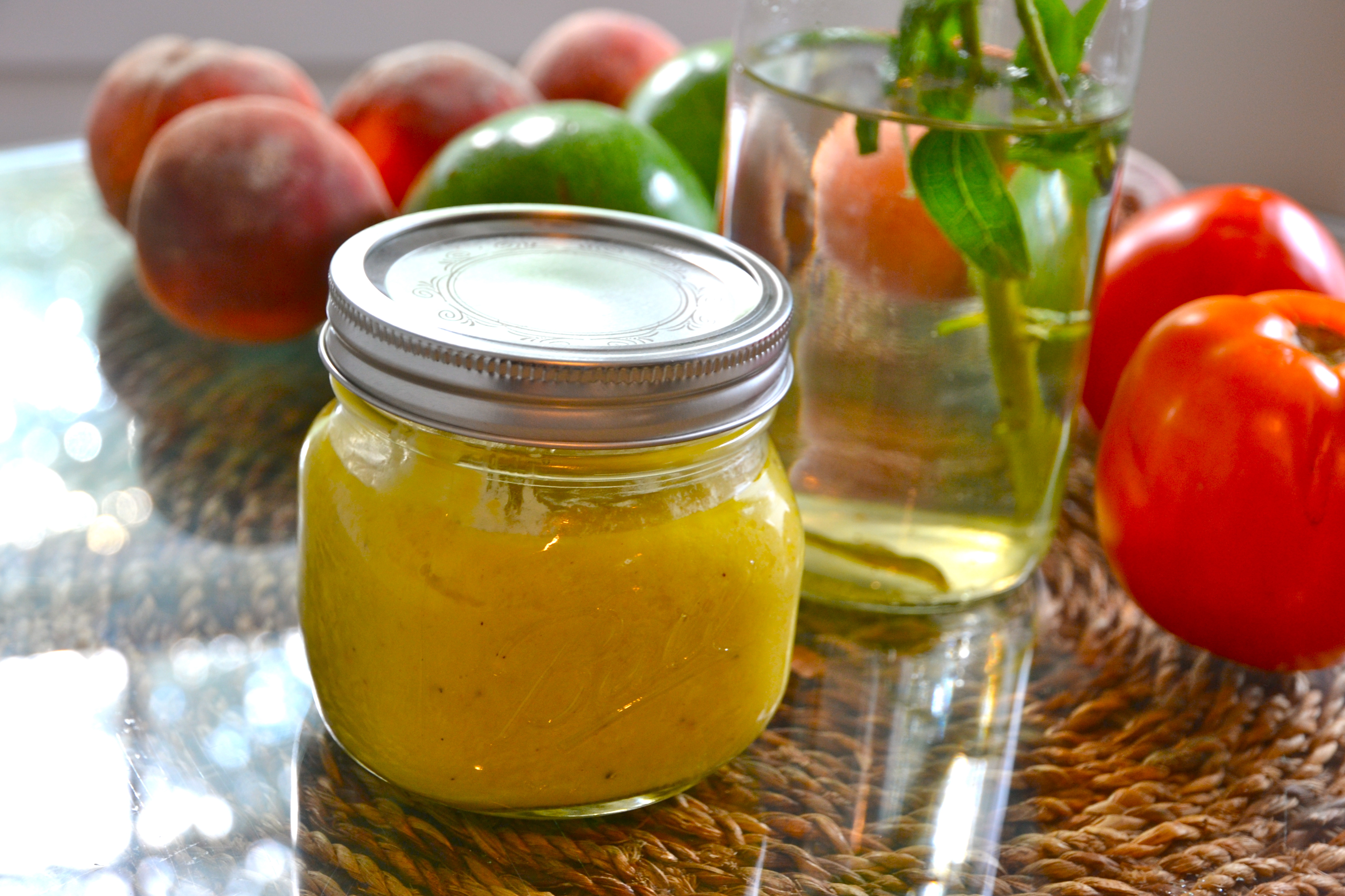 In a food processor, combine the chopped zest, strained flesh and juice, mustard an garlic. Process into a smooth puree. Add the olive oil through the feed tube. Taste for sweetness and seasoning. Add any salt, sugar or pepper needed.