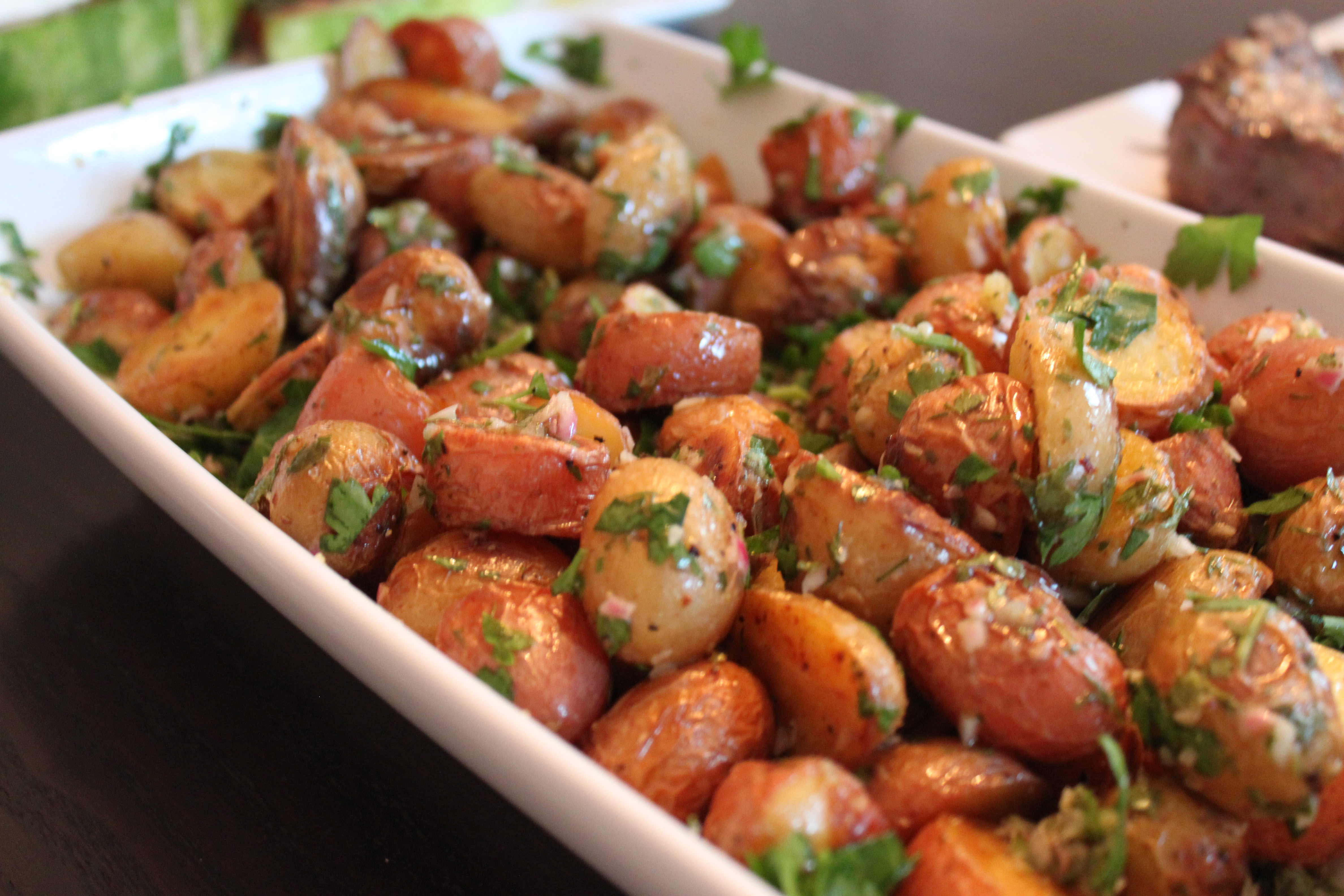 This recipe is an adaptation from the Roasted Potato, Caper and Olive Salad in How to Roast a Lamb. There are times when you need to skip a couple of steps for the sake of time and expense – this was one of them. I skipped boiling and frying the potatoes for the sake of time and energy and omitted the caper berries and olives because I thought the salad could do with out them. I was right. This “salad” was delightfully different and delicious. Nothing beats the outer crunch of a tender potato that has soaked up a salty and fresh Anchovy Vinaigrette. I added more parsley at the end for freshness (perhaps that inched it closer to a traditional salad?).