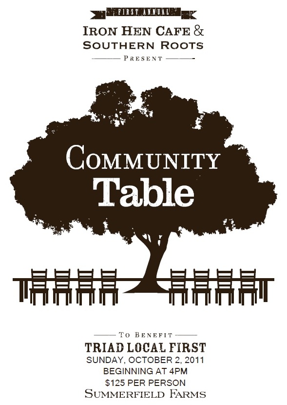 My good friends at Triad Local First, who work to keep our dollars at home and provide much-needed support to locally owned businesses, are putting together a beautiful looking dinner on Sunday, October 2nd from 4pm to 7pm at Summerfield Farms. Because my two favorite restaurants in the Triad are catering the event (Iron Hen Cafe and Southern Roots) and because I wholeheartly support the mission of Triad Local First,  I must share the details! Everything is being generously donated to make the event happen – from the food, band, farm to the decor – and I hear there will be a hayride from a Bradshaw Orell Interiors designed barn to an Outstanding In the Field-like table setting. If a beautiful Fall day on a Farm with delicious food, drinks and friends sounds too good to be true – add tax-deductible to the list.