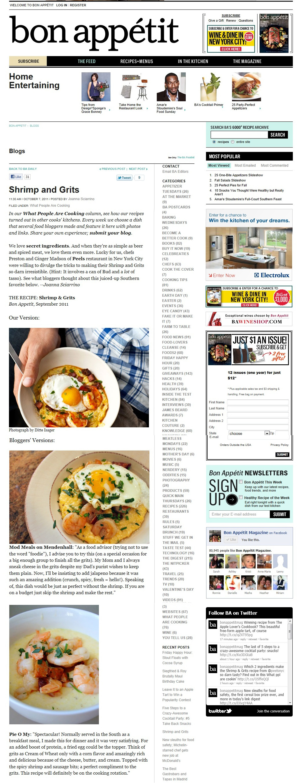 I’m ecstatic to report that my photo and blogpost of Bon Appetit’s Shrimp and Grits was featured on Bonappetit.com and the Bon Appetit blog, BA Daily! I’ve made a screen shot for bragging rights. Make sure to check out the real thing! Thanks to Bon Appetit for making my Friday!