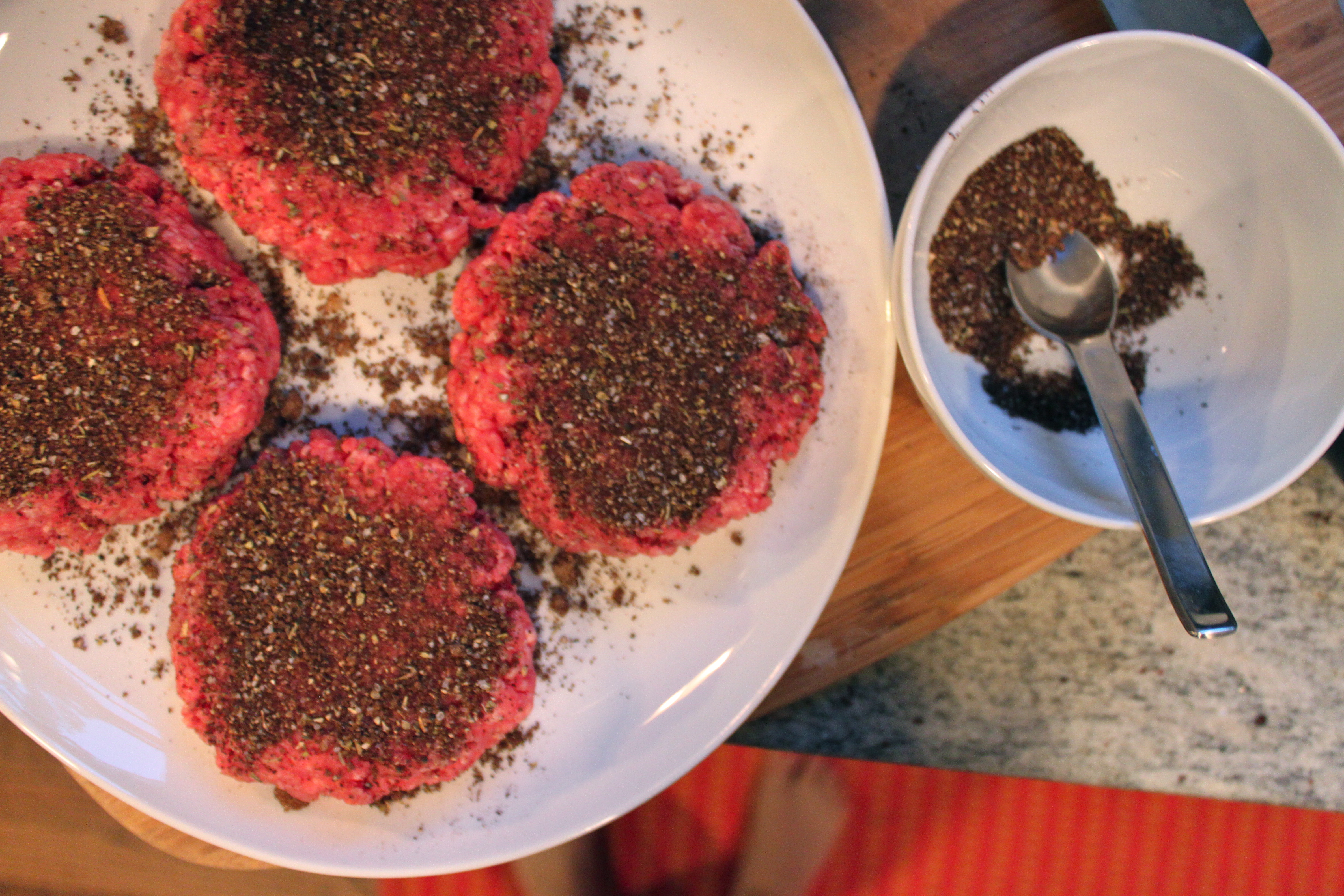 I’m a little tardy posting this recipe – excuse me! I cooked these burgers last weekend for a quiet night in. We enjoyed amazing fall weather and sweated through the burgers because they were so spicy! That is your warning – use the Texas BBQ Sauce with caution – although I think I added much more chipotle than recommended. This was the first time I’ve made a coffee rub for burgers and it was a really nice addition – the mix of coffee (I used espresso) and brown sugar helps create a night caramelization on the burger. If you’re nervous about the spice – just skip the BBQ sauce and just do the rub!