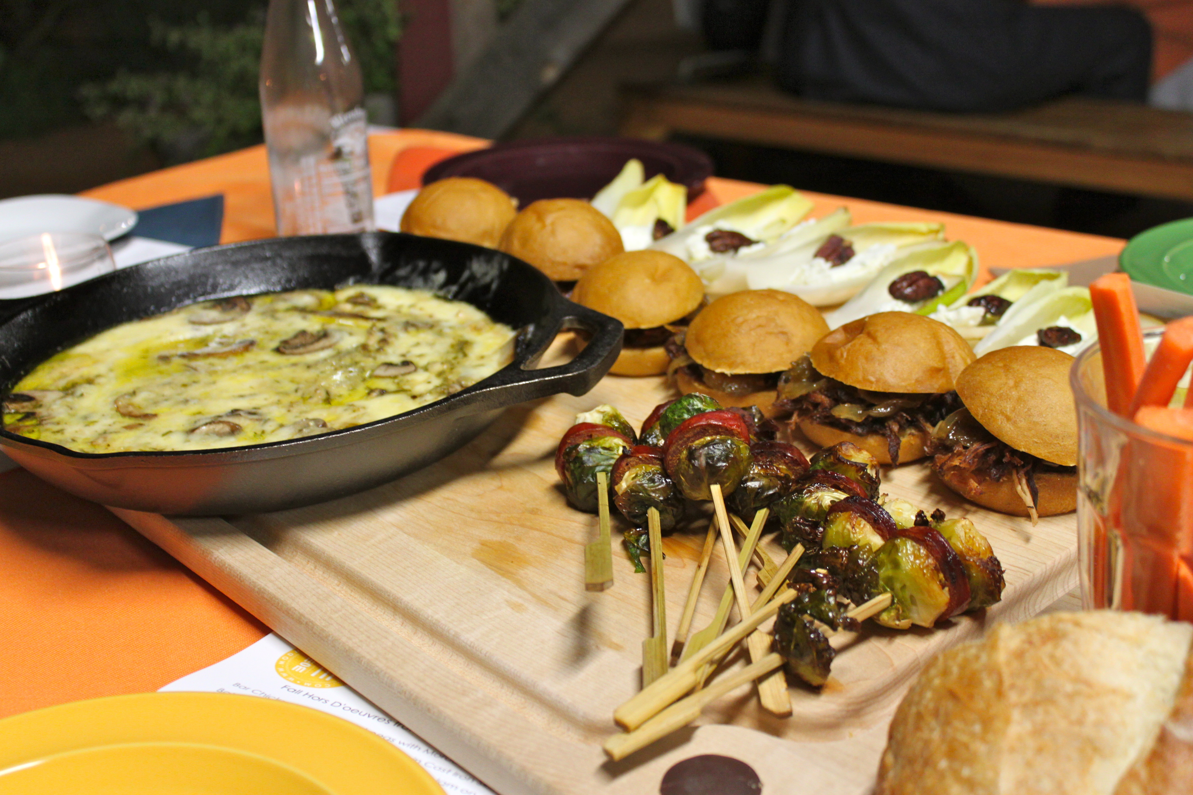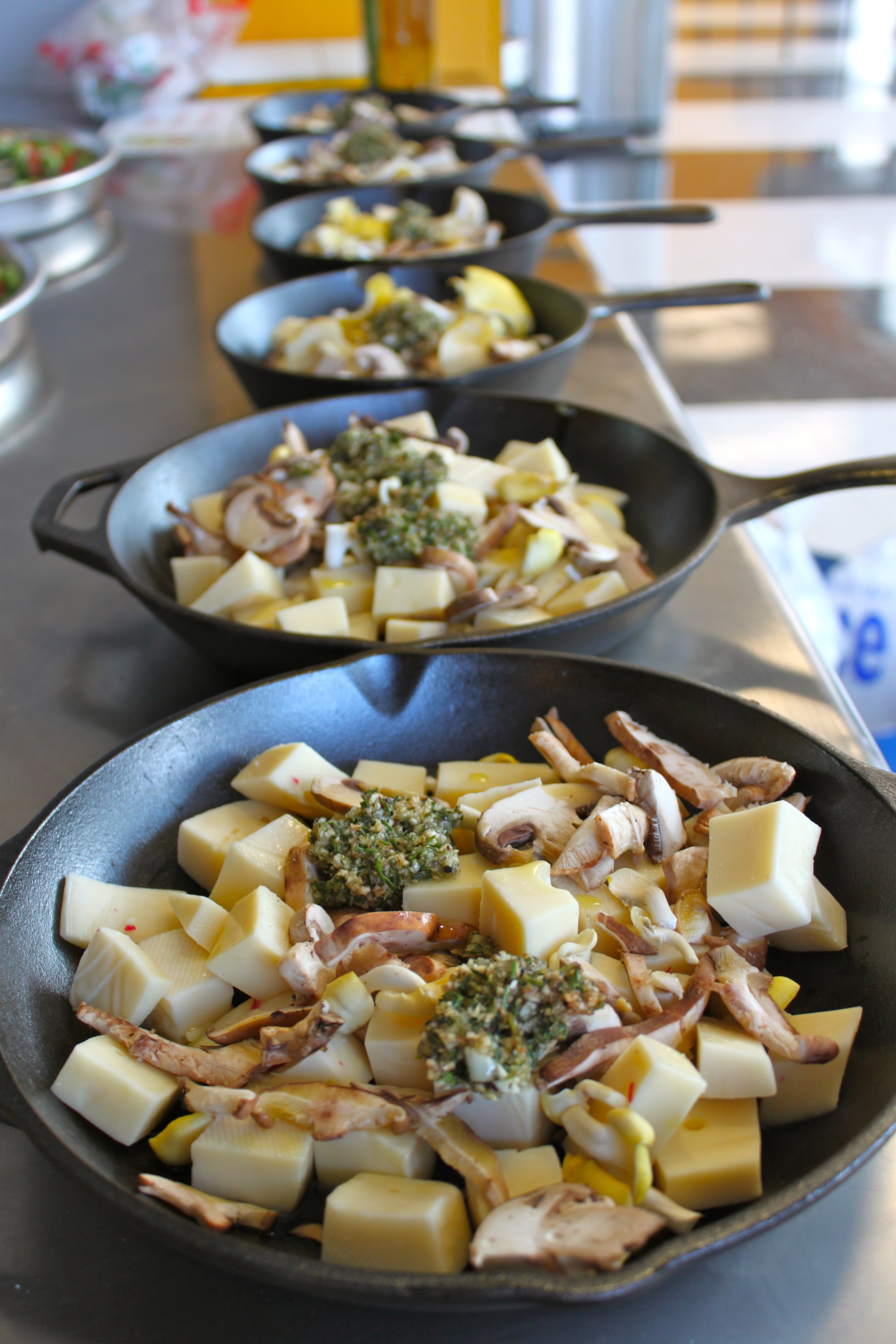 Tis the season for bubbling cheese in cast iron skillets! This is basically a twist on fondue – but much easier and festive in a southern cast iron skillet. I served these Bubbly Cast Iron Skillets of Fontina with Herbs, Garlic and Mushrooms family style at the Greensboro Children’s Museum Edible Schoolyard event for the Elmwood Garden Club. This recipe is adapted from an Ina Garten recipe but I added mushrooms for an extra touch. It was by far the easiest hors d’oeuvre on the menu too – just cubes of fontina (about a pound per skillet), chopped rosemary, thyme and garlic, a handful of assorted mushrooms, salt, pepper and a small splash of olive oil. They went into a 400 degree oven for about 20 minutes – or until bubbling hot straight to the tables. I served the cheese with French bread and carrots for dipping. Every skillet was clean by the end of the night.