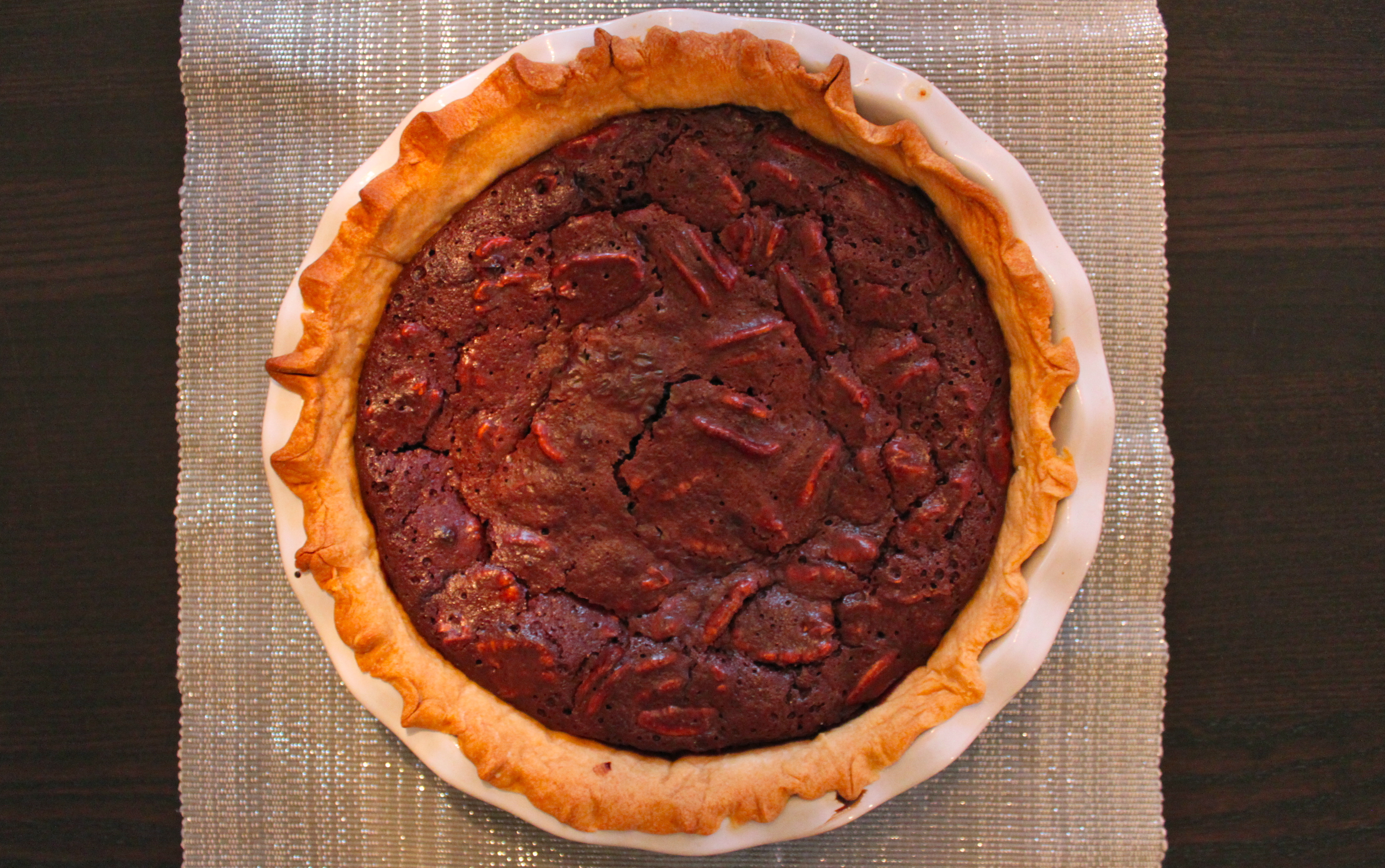 Bake your pie shell in advance. Heat the oven to 375. Melt butter and chocolate together. Add brown sugar, golden syrup and vanilla. Stir to combine and then add toasted pecans. Pour into the pie shell and bake for about an hour or until set. Once set, remove from the oven and sprinkle with sea salt.