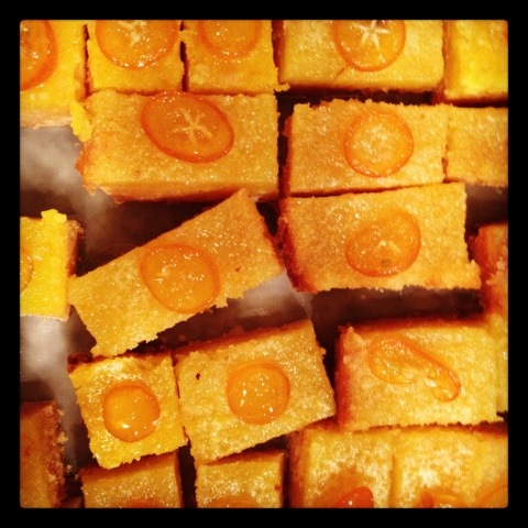 Meanwhile, make the curd. Whisk together eggs, additional yolks, additional 1/2 cup suagr, cornstarch, lemon zest and juice. Pour the curd over the golden short bread and bake for another 30 or so minutes. Allow to cool – be patient – allow them to cool! Then cut into small squares (smaller than you think – it’s zesty!). Top with slivers of candied kumquats.