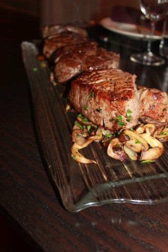 Filet Mignon over Sauteed Oyster and Cremini Mushrooms with Garlic and Green Peppercorns