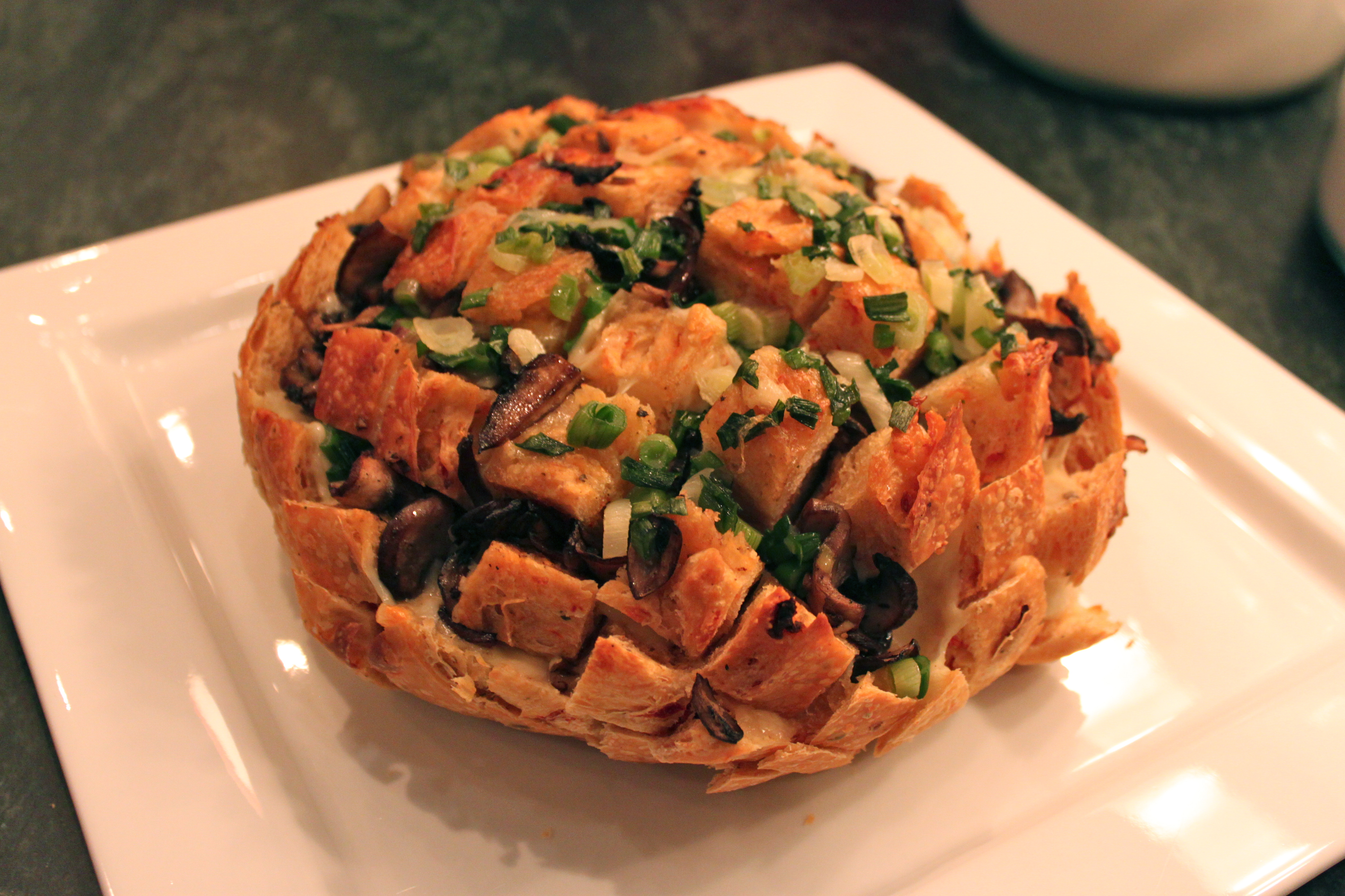 While I’m much more into the Puppy Bowl on Animal Planet, I can appreciate a holiday that centers around good food. I spent Super Bowl Sunday on Rolling Road with friends – eating lots of dip, turkey chili and this cheesey pull apart bread I made from a recipe highlighted on Apartment Therapy. I made mine with a sourdough round of bread from Loaf at the Greensboro Farmer’s Curb Market. You could also pick one up at their store downtown on the 200 block of Elm Street in Greensboro. It’s worth a trip – even if you just want to eat it as toast! I also cut back on the butter in this recipe – I don’t think you need it. If I made it again, I’d look for another cheese with more of a kick – but with the same melting factor. Maybe a swiss? Play around with this – it’s a fun recipe. Cheesey Mushroom Pull Apart Bread from Beantown Baker