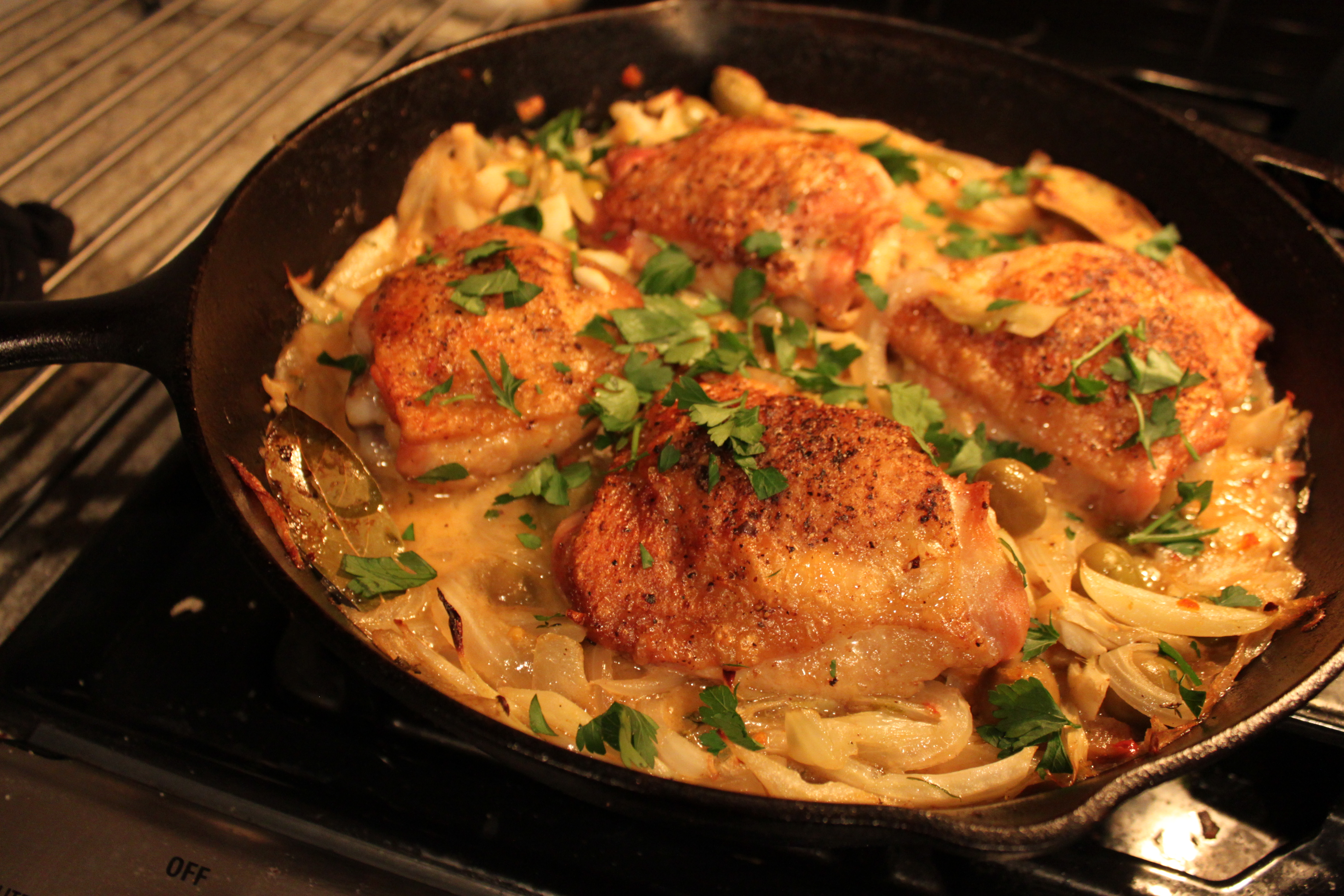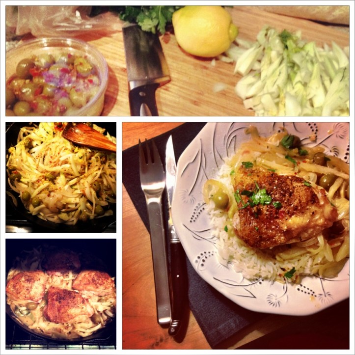 Add olive, red pepper flakes, thyme, bay leaf and zest and cook for 1 minute. Add wine and simmer for two minutes to reduce. Add chicken stock and bring to a simmer. Nestle chicken back into the pan so it is sitting on top of fennel skin side up, and just 1/4 submerged.