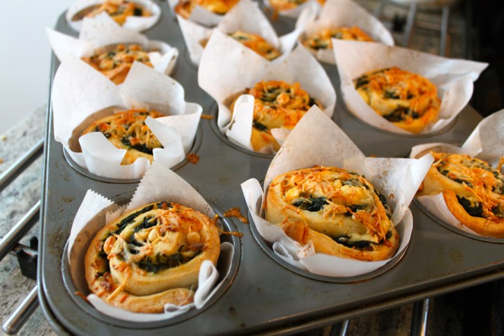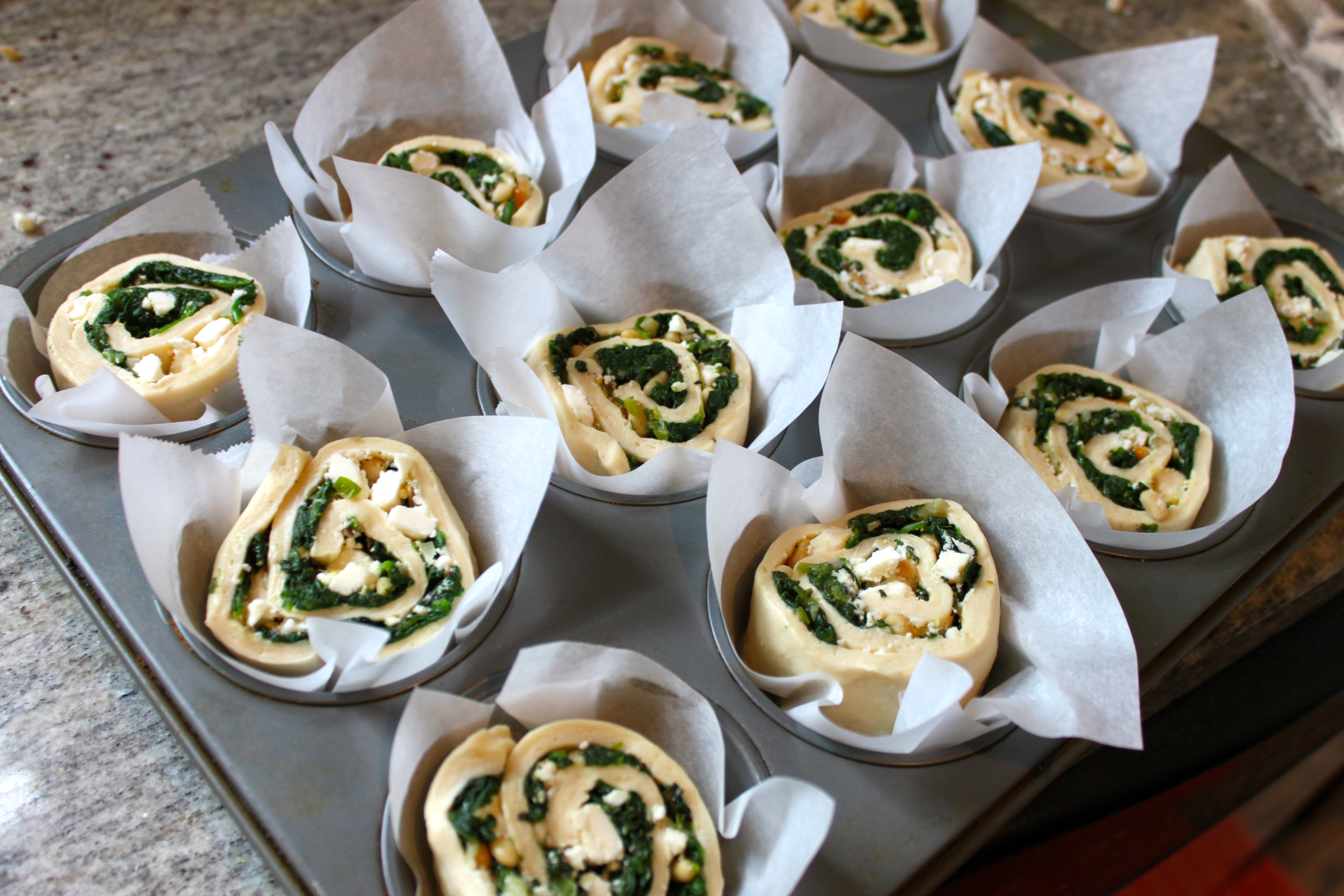 On a well-floured surface, unroll pizza dough and shape into a 12×8-inch rectangle. Spread spinach mixture to within 1 inch of the edges of dough. Sprinkle with feta cheese and pine nuts. Dust with lemon zest. Starting with one of the long sides, roll dough into a spiral. Slice roll into 12 pieces.