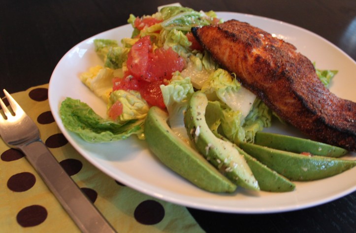 This salad is full of Florida winter citrus – lemon vinaigrette and grapefruit plus avocado and fish. Although it’s winter – it’s seriously refreshing during these super warm days we’ve been having in North Carolina. I love the combination of these ingredients and grew up eating them often. I used salmon, which isn’t a Florida fish, but I’m a big fan of its flavor and texture. Pretty much any fish will work with this recipe so pick what you like – is around – or on sale! You can use any spice you prefer – add some paprika or cayenne if you want to spice it up! This really isn’t much of a recipe – but a different idea for your next salad night!