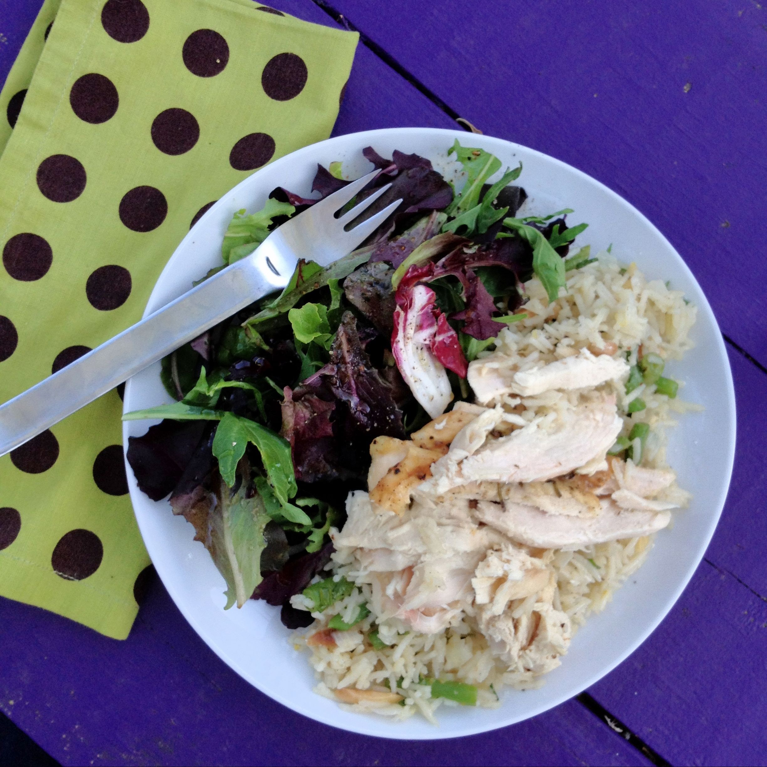 This weekend I made a roast spring chicken with lots of herbs and paired it with a seasonal side dish from Sara Foster’s cookbook. Recently, I’ve really started trying to mix up recipes for my everyday eating, but when it comes to comfort food, nothing beats a simple roasted chicken with rice. I relied on Sara’s book to help mix it up a bit and she provided the perfect solution with her “Rice Pilaf for All Seasons.” I swapped peas for green beans and added the chicken stock straight from the bottom of my roast chicken pan. You can make your own edits too. I love the addition of coconut milk (I used the reduced fat version) and crunch from toasted almonds. Try this next time you’re trying to mix things up in your kitchen!