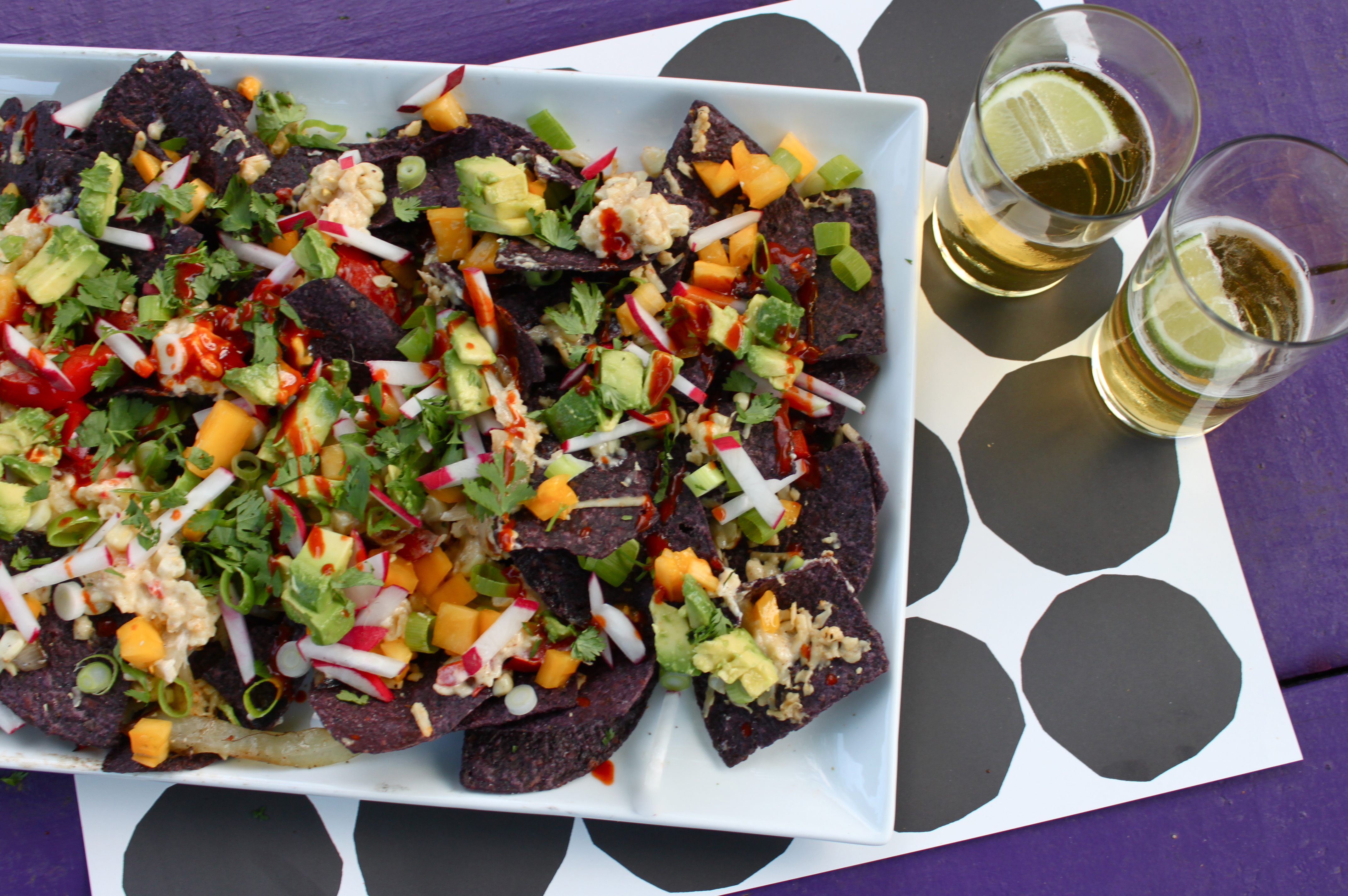 Once the cheese is melted, carefully pick up the tray and transfer the nachos to a large platter. Top the nachos with scallions, tomato, radishes, avocado and hot sauce. Feel free to add any other toppings you may enjoy – local chorizo, bacon or seasoned grilled beef would make an excellent addition!