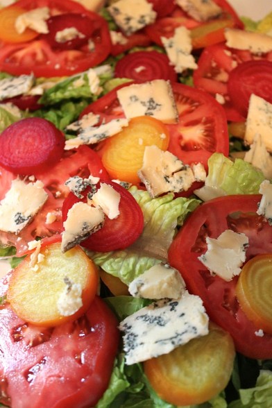 Wrap beets in a foil pouch with a little olive oil and salt. Roast in a 400 degree oven for about a half hour – or until a sharp knife can easily cut them. Once cooled, use your hands to remove the skin. Slice the beets and tomato and pile on top lettuce of your choice. Top with chucks of stilton. Drizzle with red wine vinegar, olive oil, salt & pepper.