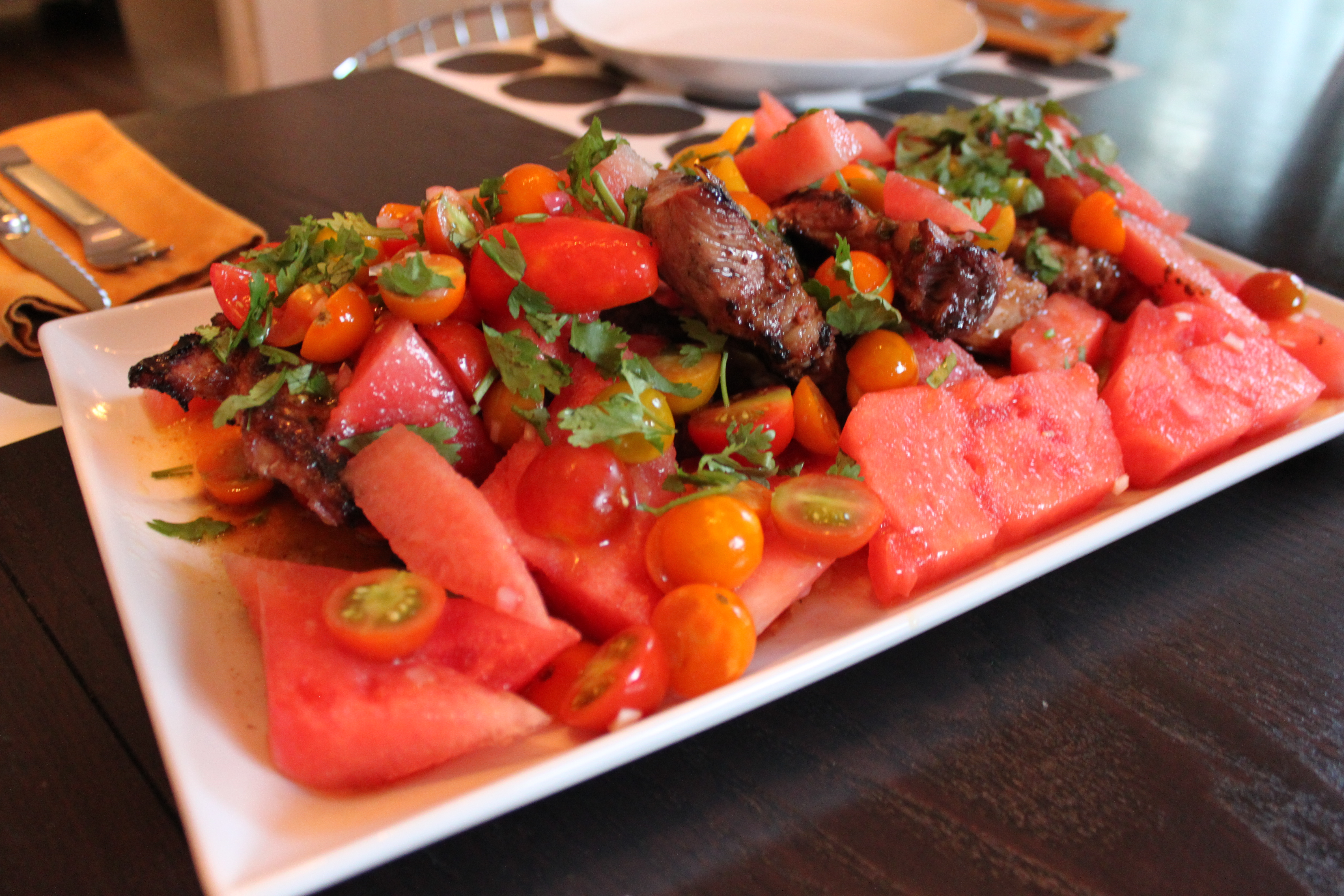 I made this recipe on Saturday night with friends – although I substituted pork chops for country-style ribs. I was happy to find a plethora of colorful small tomatoes at the market and watermelon on sale at most grocery stores. If I did it again, I’d marinate overnight but 6 hours was plenty of time for a nice flavor.