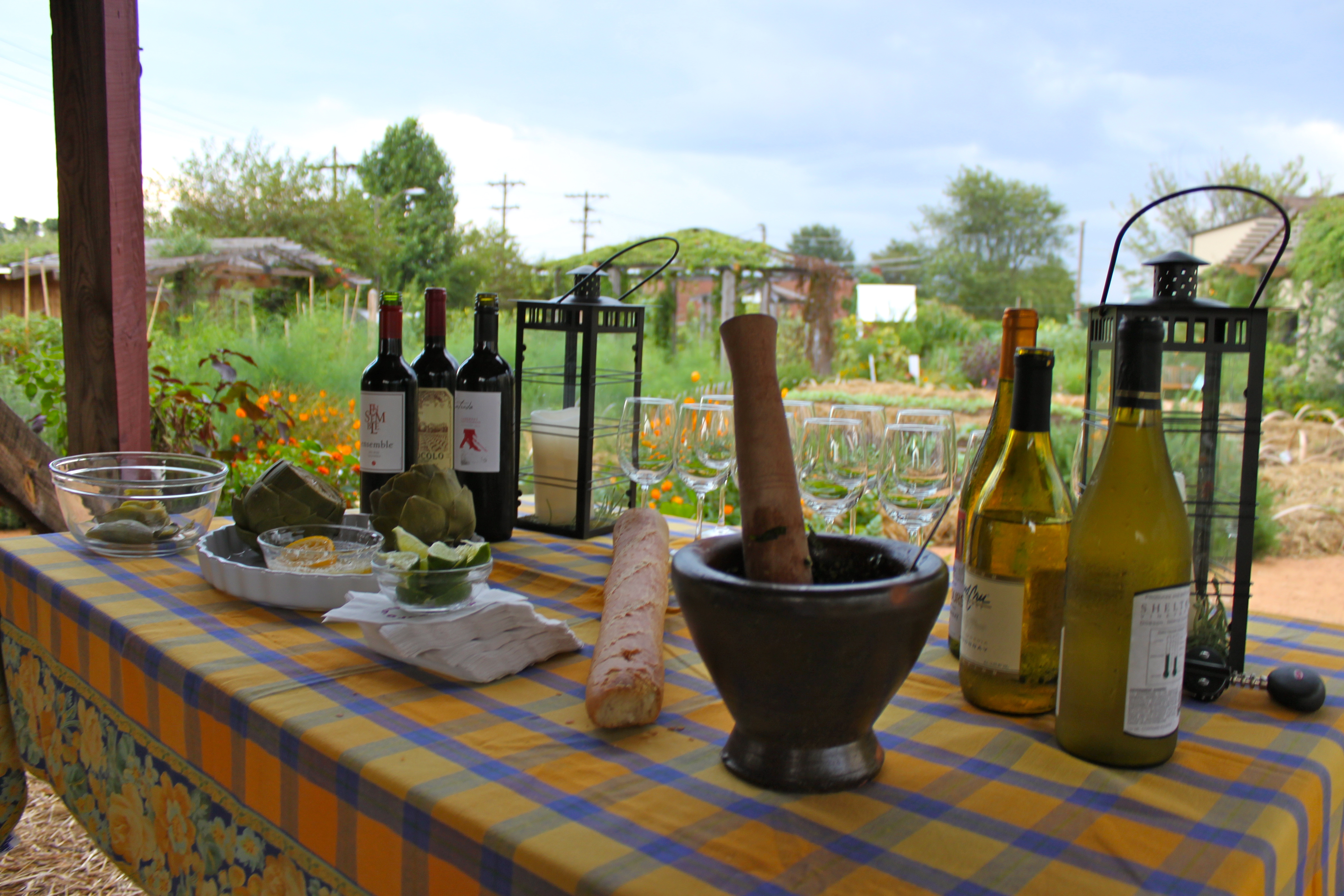 This weekend I hosted a group of ten new friends this weekend at the Greensboro Children’s Museum Edible Schoolyard. This class was a part of the Museum’s Green Acres Gala auction this Spring. I was excited when my friend Jim King won the item because I knew he would bring a fun crew to class. I designed this class with their fun, flexible and friendly spirit in mind. We cleaned whole red snapper in the Mud Cafe and dined under the stars in the Edible Schoolyard Barn. I’m not sure what was the most fun but I loved watching the ladies compete in a hand-whipped cream challenge before dessert.