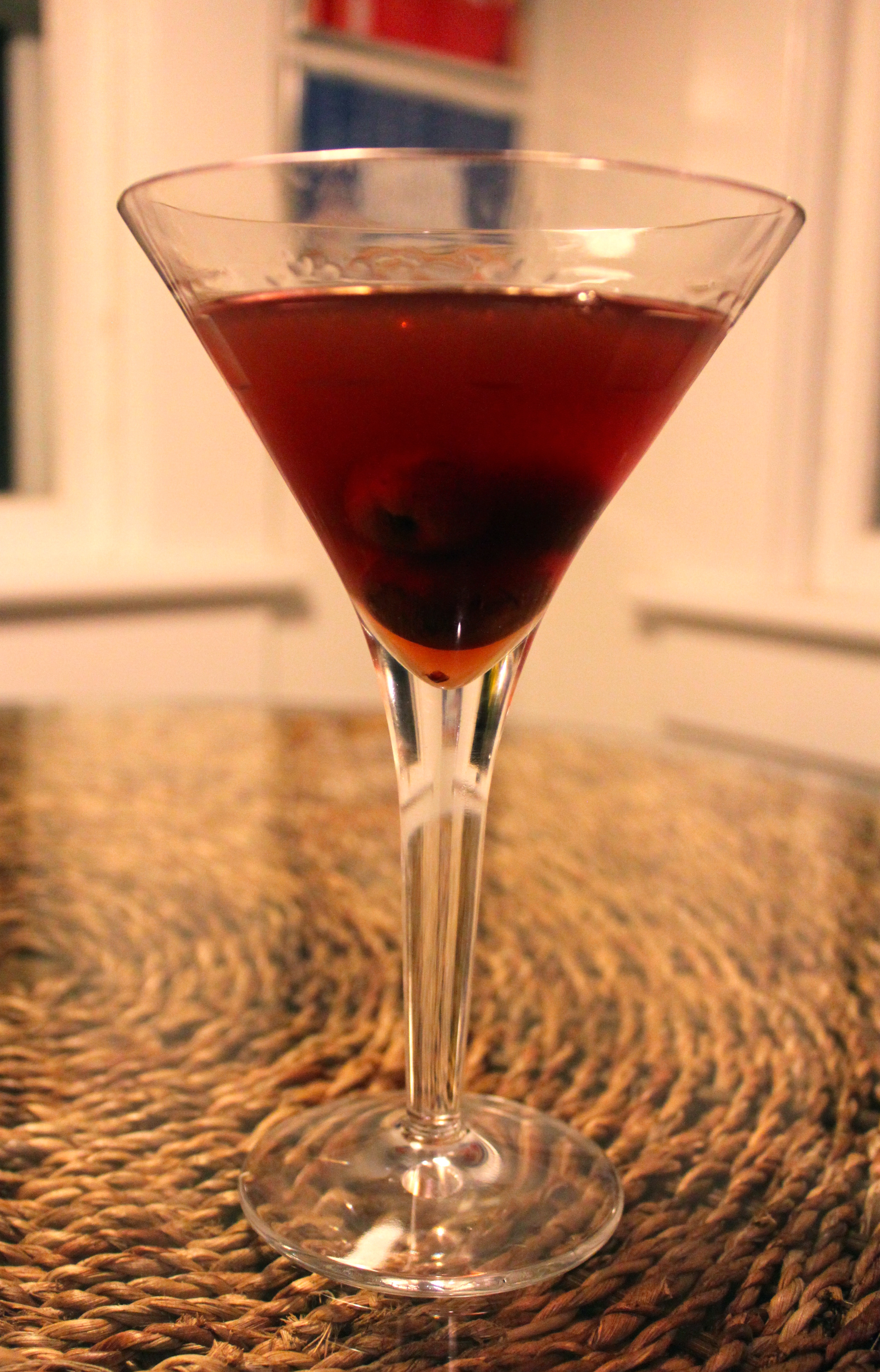 Manhattan = bourbon + couple dashes of bitters + splash of vermouth + cherries+ stirred on ice, served in a martini glass.